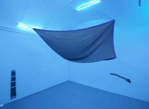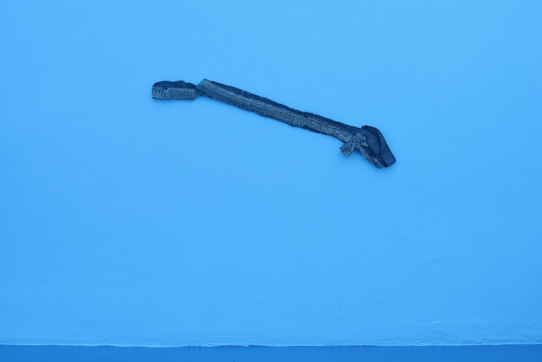 Come Yinka Shonibare tracciava le rotte commerciali dei tessuti, per rimarcare quelle degli schiavi, o Ibrahim Mahama segnava le speranze dei migranti con i sacchi di juta, Hana Miletić consegna alle trame della tessitura un ruolo sociale (finanche politico e ambientale) di indiscusso valore. Un prendersi cura che solo con dedizione, e col tempo e nel tempo, può concretizzarsi. Principio che è il fondamento di tutto quello che è realizzato a mano. Con i lavori creati per questa mostra, che proseguono quanto avviato con Materials nel 2015, Hana Miletić si sofferma sugli interventi che le persone compiono per riparare delle cose vecchie o rotte, anziché sostituirle con qualcosa di nuovo. Gesti nei quali ravvisa il desiderio di preservare piuttosto che sostituire, veloce prassi che caratterizza la nostra epoca, evidenziando quelle silenziose forme di solidarietà -soprattutto nello spazio pubblico- che, poco visibili, sussistono intorno a noi. Un po’ come trattenere, tenere per sé, la saldatura del kintsugi. Prendendo come punto di partenza le fotografie da lei scattate, nello spazio urbano, a questi atti di riparazione, li ricrea servendosi, appunto, della tessitura, utilizzando fili principalmente recuperati, frammezzandoli con fibre di legno o fili di poliestere. Nello specifico della mostra romana, Hana Miletić pone particolare attenzione a quei materiali (come teloni, nastri adesivi, lacci di nylon) che curano e sostengono le piante ferite, aggiungendo anche quell’illuminazione blu, tipica per favorire la fotosintesi, creando, in questo modo, un’atmosfera sospesa, ovattata, pressoché onirica, che sfoca i contorni e dilata il tempo.