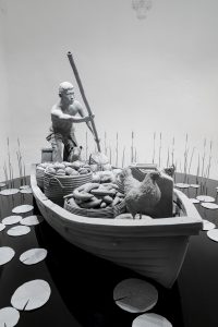 Sono di grande impatto, visivo ed emotivo, le opere realizzate da Hans Op De Beeck (Turnhout, 1969) per l’equilibrata e notevole, personale “The Boatman and Other Stories” che, tra acquarelli e sculture, vede l’esposizione di quasi una ventina di lavori, comprese le splendide “vetrine” Wunderkammer 11 e 12. È proprio l’uomo della barca / il barcaiolo (2020), a grandezza naturale, posto nel foyer dell’ex cinema di San Gimignano, a “traghettare” il visitatore nell’articolato percorso espositivo della Galleria Continua, nella sede di via del Castello 11. In piedi, a torso nudo, intento a sospingere con una (vera) canna di bambù la sua piccola imbarcazione ricolma di tutti i suoi averi, compresi un piccolo cane e una gallina, nonché di generi alimentari, The Boatman conduce la sua barchetta verso chissà quale destinazione, sicuramente alla ricerca di una vita migliore. Nelle recenti produzioni dell’artista belga, è da notare “Other Stories”: egli individua un soggetto centrale e, intorno ad esso, costruisce a raggiera, per l’appunto, altre storie (è stato così pure per The Horseman, anch’esso un nomade, un viaggiatore solitario, presentato sempre nella GalleriaContinua nel luglio 2020).