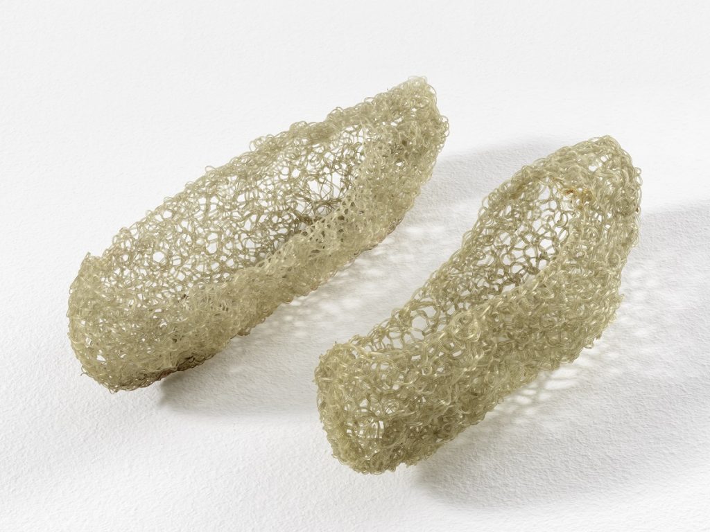 Realizzata nel 1968, Scarpette è una delle prime opere di Marisa Merz. Malinconica, onirica, fugace, delicatamente intrecciata con filo di nylon, la scultura fa parte dell’ampio ciclo di lavori che Merz dedicò al contesto domestico e alla vita quotidiana, realizzate con «poco impegno e senza pretese», come lei stessa spiegava. Intrecciano la dimensione intima a quella pubblica, la serie delle Scarpette, in particolare, è legata all’infanzia della figlia Beatrice. Delle poche versioni che sono state realizzate, dal 1968 alla metà degli anni ’70, sia in nylon che in rame, questa è la prima a essere esposta permanentemente in una collezione pubblica.