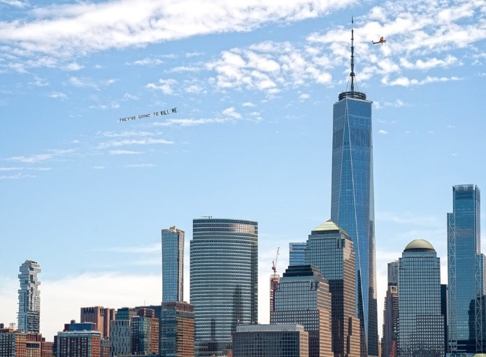 Il 30 maggio sopra Detroit è volato lo striscione con la frase Please I can’t breathe (per favore, non riesco a respirare), a Dallas, My neck hurts (mi fa male il collo), a Los Angeles, My stomach hurts (mi fa malo lo stomaco), a Miami, Everithing hurts (mi fa male tutto), a New York, They’re going to kill me (mi stanno per uccidere): questo sono state le frasi pronunciate da George Floyd pochi prima di morire sotto il ginocchio dell’ufficiale di polizia di Minneapolis Derek Chauvin, dopo oltre otto minuti di pressione.