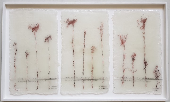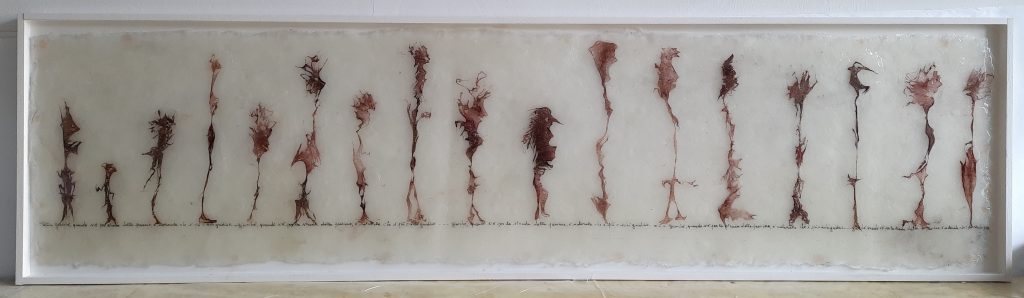 La morte di Cecilia. Promessi Sposi di Alessandro Manzoni 1827, Tecnica mista su fibra, pelle e inchiostro di Calamaro, metacrilato, 120x75 cm, 2019, courtesy l’artista