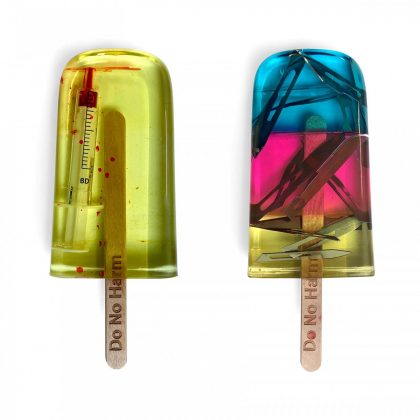 Sono belli e colorati, ma occhio al loro contenuto. Si tratta dei ghiaccioli di Miss Bugs, il gruppo di Media artists che da tempo indaga sulla nostra dipendenza dalla tecnologia digitale. 900 i ghiaccioli realizzati per la mostra “Do No Harm”, ospitata dalla Jealous Gallery di Londra. Tre strati di resina contengono antidolorifici, siringhe, lame di bisturi e prodotti farmaceutici in generale, così i lecca-lecca dall’apparenza così vivace sono espressa critica alla società contemporanea e al suo utilizzo dei social media. L’accattivante involucro, per quanto trasparente, nasconde quella che il gruppo definisce «malattia interiore». «La tecnologia digitale, pur essendo un edulcorante nella nostra vita, ci distrae perennemente con un flusso costante e coinvolgente di informazioni e tentazioni. Internet diventa uno spazio in cui la ragione e la logica sono raggiunte da false notizie, e le persone con opinioni estreme possono gridarsi a vicenda». La mostra, dopo essere stata ospitata dalla Jealous Gallery nella sua sede ubicata nello Shoredicht, sarà visitabile nella sede della Galleria sita a Crouch End, dal 4 al 29 settembre 2019. È in quest’occasione che i lecca-lecca, confezionati come medicinali, saranno in vendita, ma occhio: non sono commestibili.