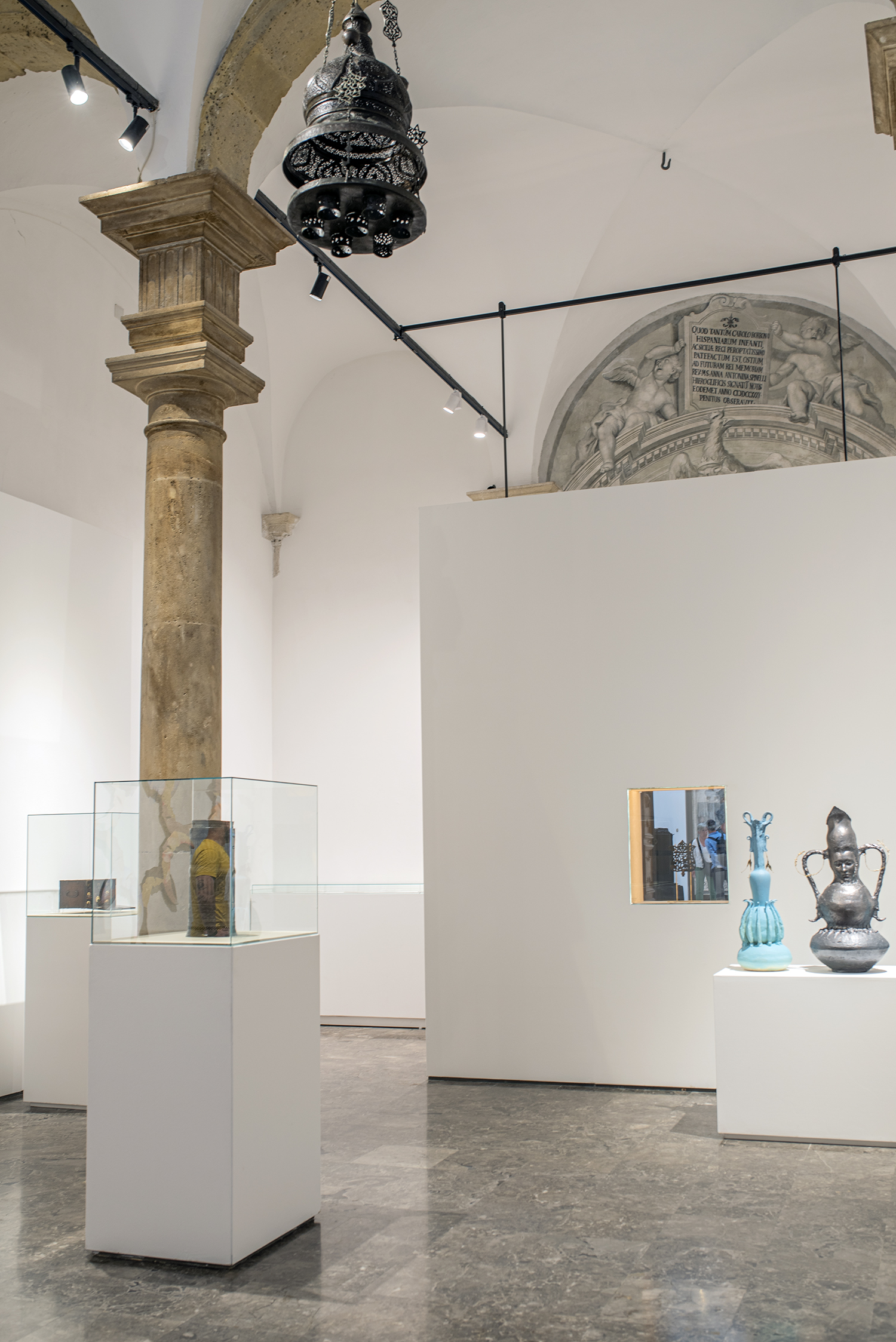 I riferimenti al mondo arabo sono presenti in quasi tutte le opere presenti degli artisti. Gili Lavy, artista di Gerusalemme con base a Londra, ha presentato un’opera sonora in collaborazione con il musicista Jacopo Salvatori in cui vengono evocate in lingua sabir, riferendosi al museo come luogo di contaminazione di culture diverse (forse colpisce l’aspetto a-critico dell’opera nei confronti del museo quale apice dell’appropriazione coloniale, tema di cui per fortuna si parla tantissimo a oggi). Maggi realizza sculture con invocazione al poeta arabo-siculo al-Ballanūbī.