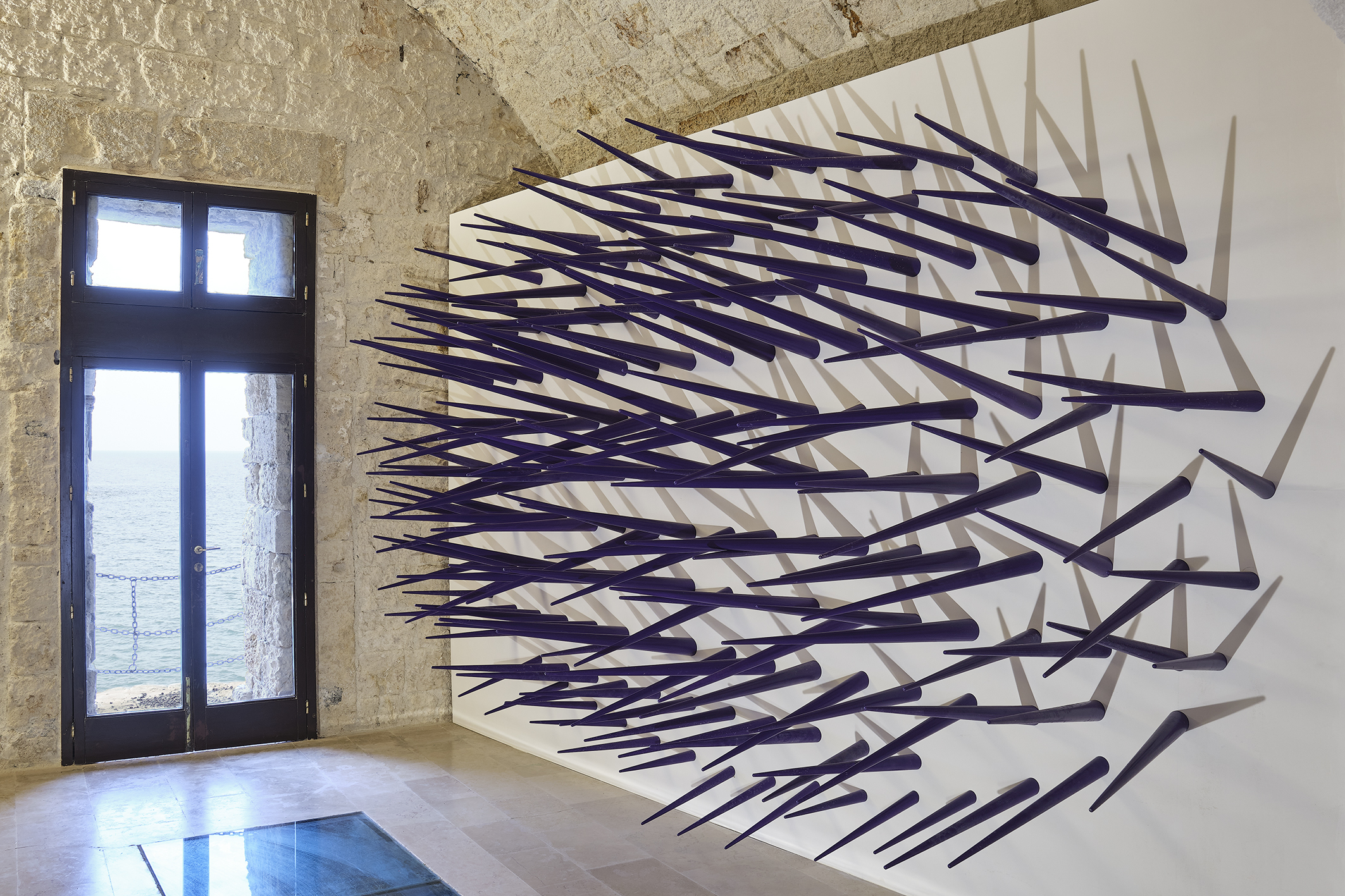L’incipit del percorso monopolitano è segnato da Gabbia magica, rielaborazione recente di Cubo magico, lavoro del 1981, esposto nell’importante antologica dell’artista svoltasi nel 2008 alla Pinacoteca Provinciale “Corrado Giaquinto” di Bari ed ancora oggi esposta, in forma permanente, nello stesso museo: una gabbia di rete metallica in cui sono infilzati migliaia di cartucce, piccoli coni di carta rievocativi del gioco infantile della cerbottana. Un’opera fondamentale, che sul principio degli anni Ottanta ha segnato ufficialmente il passaggio (già in atto da un biennio) dalla prima fase pittorica di estrazione ecologista alla più matura fase scultorea, e che oggi sancisce un nuovo ritorno alla pittura (percepibile soprattutto nella sede di Conversano), seppur con modalità totalmente mutate. Un’opera interattiva che accoglie al suo interno e respinge all’esterno, irta com’è di aculei. In essa spazio interno ed esterno si compenetrano facendo dell’installazione un organismo complesso di cui lo spettatore, una volta abitato, diventa il cuore pulsante, quell’elemento imprevisto e imprevedibile che alla gabbia dona la sua ragione di esistere. Nessuna reclusione (la gabbia ha un lato aperto e nessuna porta di chiusura), nessuna costrizione ma accoglienza. Nella scelta della parola “gabbia”, comunemente associata ad una situazione di imprigionamento, si cela in realtà il fare ironico dell’artista che non disdegna di giocare con sensazioni contrastanti, sfruttando simboli e immagini a suo piacimento, traslandone non di rado i significati verbali e visivi in evidenti doppi sensi.