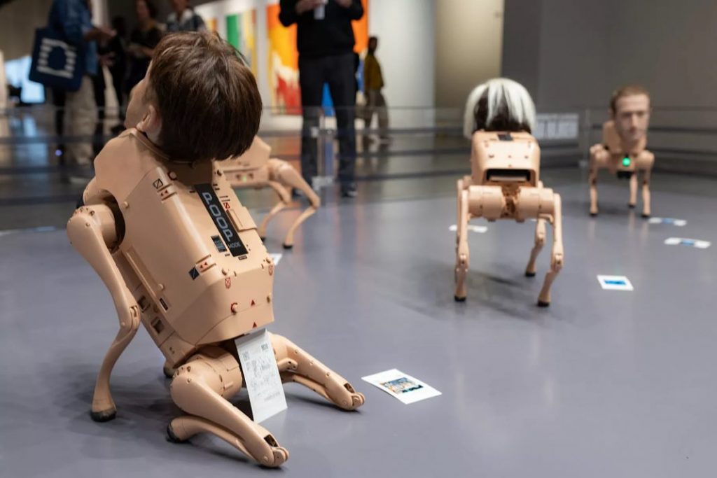 L’opera, viralissima sui social fin dal proprio debutto, consiste in un “branco” di cani robot autonomi, dotati di teste iperrealistiche modellate su celebri personaggi della società contemporanea, come Elon Musk, Mark Zuckerberg e Jeff Bezos, ma anche sui maestri dell’arte del Novecento, come Andy Warhol e Pablo Picasso. Le creature robotiche si muovono liberamente nello spazio espositivo grazie a sensori e sistemi autonomi, osservando l’ambiente con telecamere integrate. Le immagini raccolte vengono poi elaborate da sistemi di intelligenza artificiale. Il risultato è poi stampato e distribuito ai visitatori in una modalità volutamente provocatoria: le immagini vengono infatti espulse dalla parte posteriore dei robot.