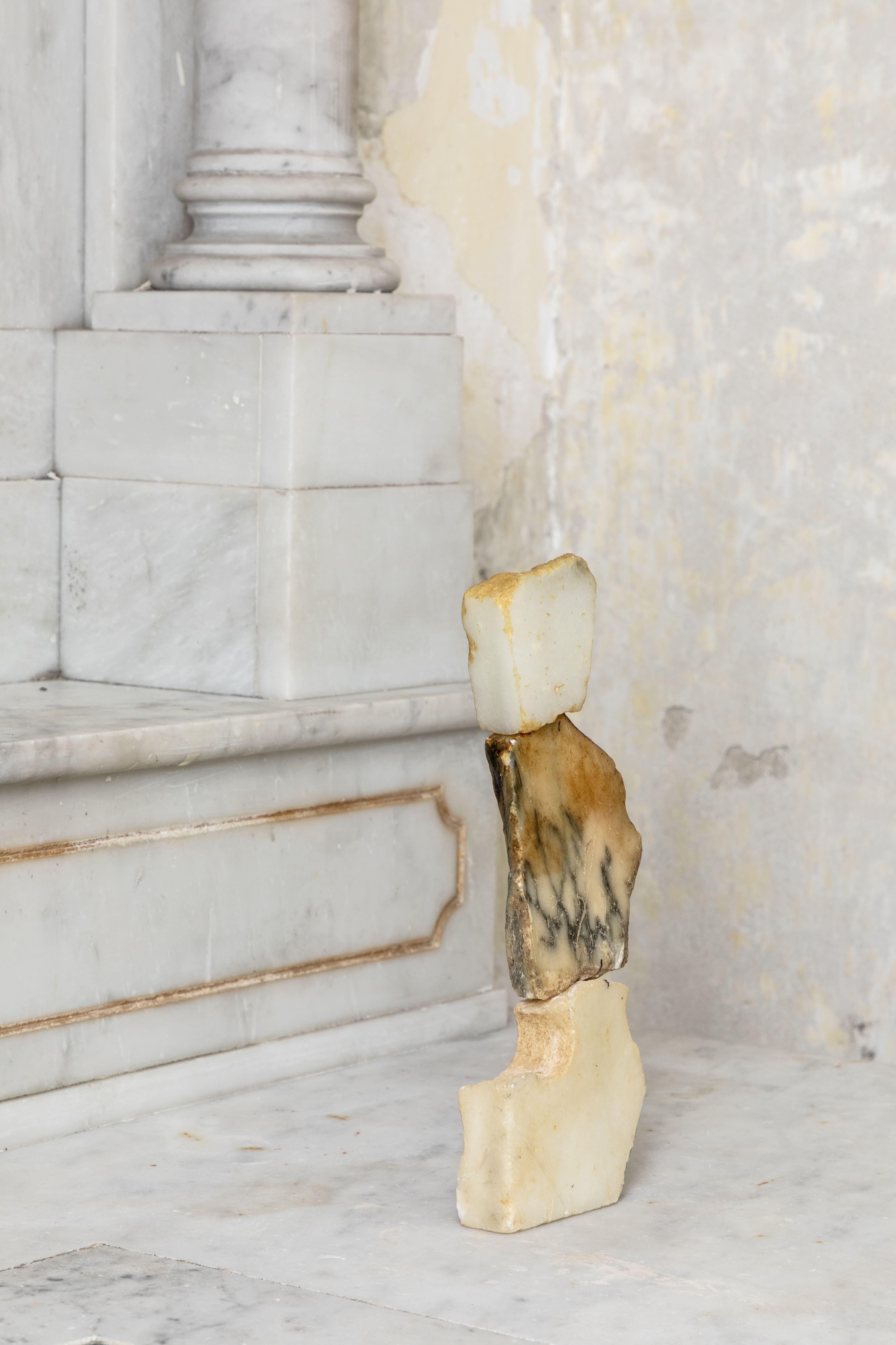 Il piccolo totem di pietre in equilibrio di Jorge Peris – tre pietre raccolte durante lunghe passeggiate sul lago El Palmar – vive di un’energia trasmessa dalle sue stesse mani e dalle vibrazioni che queste vivono/assorbono in studio.A contribuire invece con un approccio performativo al progetto è Allison Grimaldi Donahue con il testo scritto e recitato in pubblico per l’occasione, The Shapes Narcissus Sees: My Angles All Rest in Your Shadow, che crea un sottile filo narrativo mettendo in relazione le opere in mostra, lo spazio, il pubblico. InoltreVicky K. ha contribuito con una performance sonora, utilizzando come stage il negozio di Frutta da Gaetano, antistante lo spazio di Flip».
