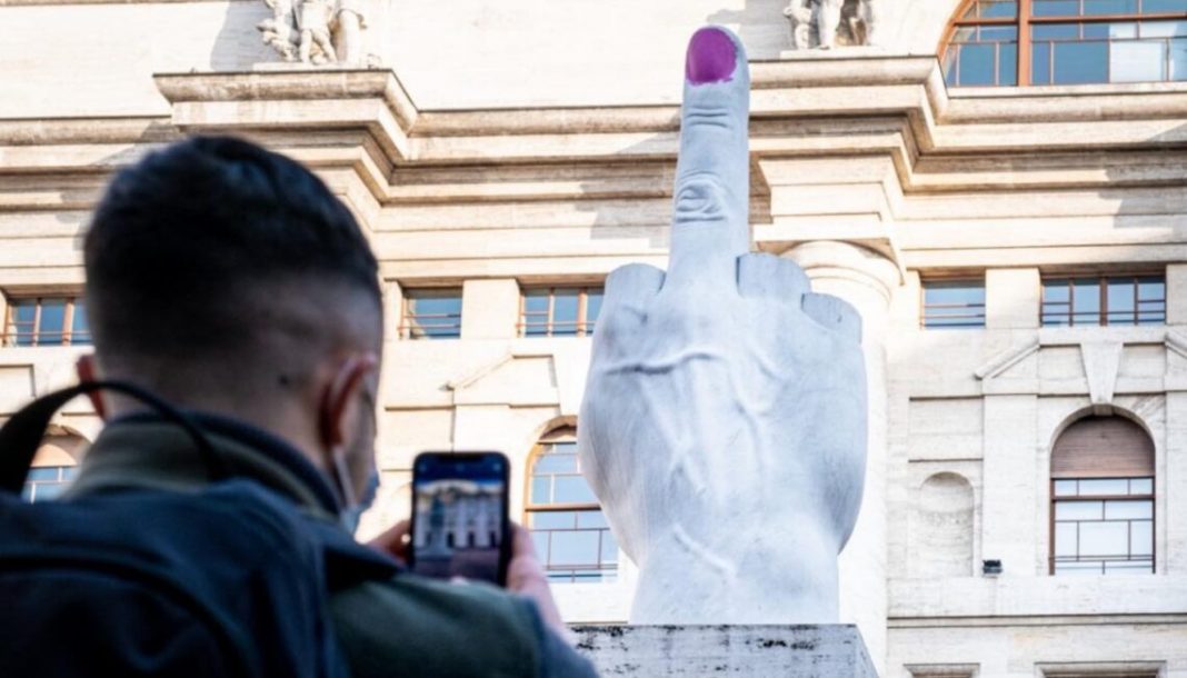 Lo street artist e poeta Ivan Tresoldi ha messo uno smalto rosa sull’unghia di LOVE, l’iconico dito medio di Maurizio Cattelan in piazza Affari a Milano, in omaggio ai movimenti femministi