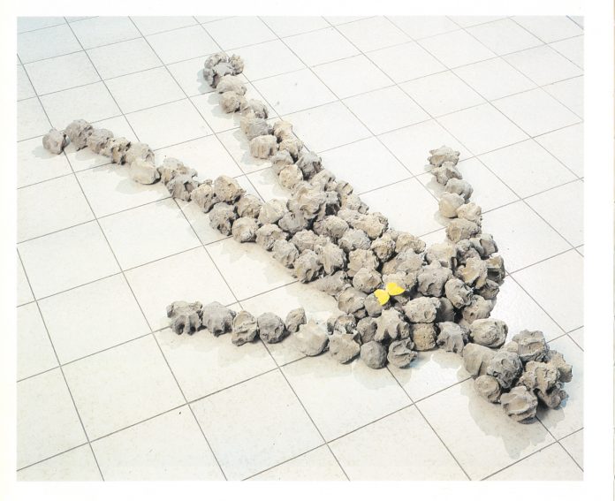 Oltre al grande polittico Storia naturale della moltiplicazione (1974-1975), la Sala Bianca dell’Accademia accoglie due opere iconiche del “mago” Boetti: Io che prendo il sole a Torino il 19 gennaio 1969 (1992) e Gemelli (1968). Lavori densissimi di significazione. La sagoma sdraiata in blocchetti di cemento a presa rapida, ha in nuce l’idea dell’uomo Vitruviano oltre che della scultura. E la farfalla posata sulla spalla appare quasi un anaffettivo richiamo ad una Déjeuner sur l’herbe.