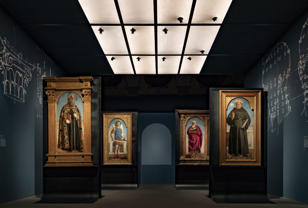 Queste considerazioni riguardano anche gli otto pannelli del Polittico degli agostiniani, dipinto da Piero per l’altare maggiore della vecchia Chiesa di Sant’Agostino a Borgo San Sepolcro (oggi Chiesa di Santa Chiara) e giunti fino a noi dallo smembramento avvenuto nel XVI secolo. Le componenti sopravvissute della pala, che impegnò il pittore per molti anni – dal 1454 al 1469 – sono oggi custodite fra diversi musei europei e statunitensi. Al Museo Poldi Pezzoli di Milano, proprietario del pannello con la raffigurazione di San Nicola da Tolentino, è esposta – in una mostra ideata dalla direttrice Alessandra Quarto, curata da Machtelt Brüggen Israëls e Nathaniel Silver, organizzata da Lavinia Galli e Federica Manoli e coordinata da Arianna Pace – la ricostruzione del polittico, resa possibile da impegnativi prestiti internazionali. Le varie parti sono inserite in un allestimento curato dell’architetto Italo Rota e dello studio di design CRA-Carlo Ratti Associati. La visione dei pannelli riflette la giusta composizione del polittico e tiene conto della situazione di originaria illuminazione.