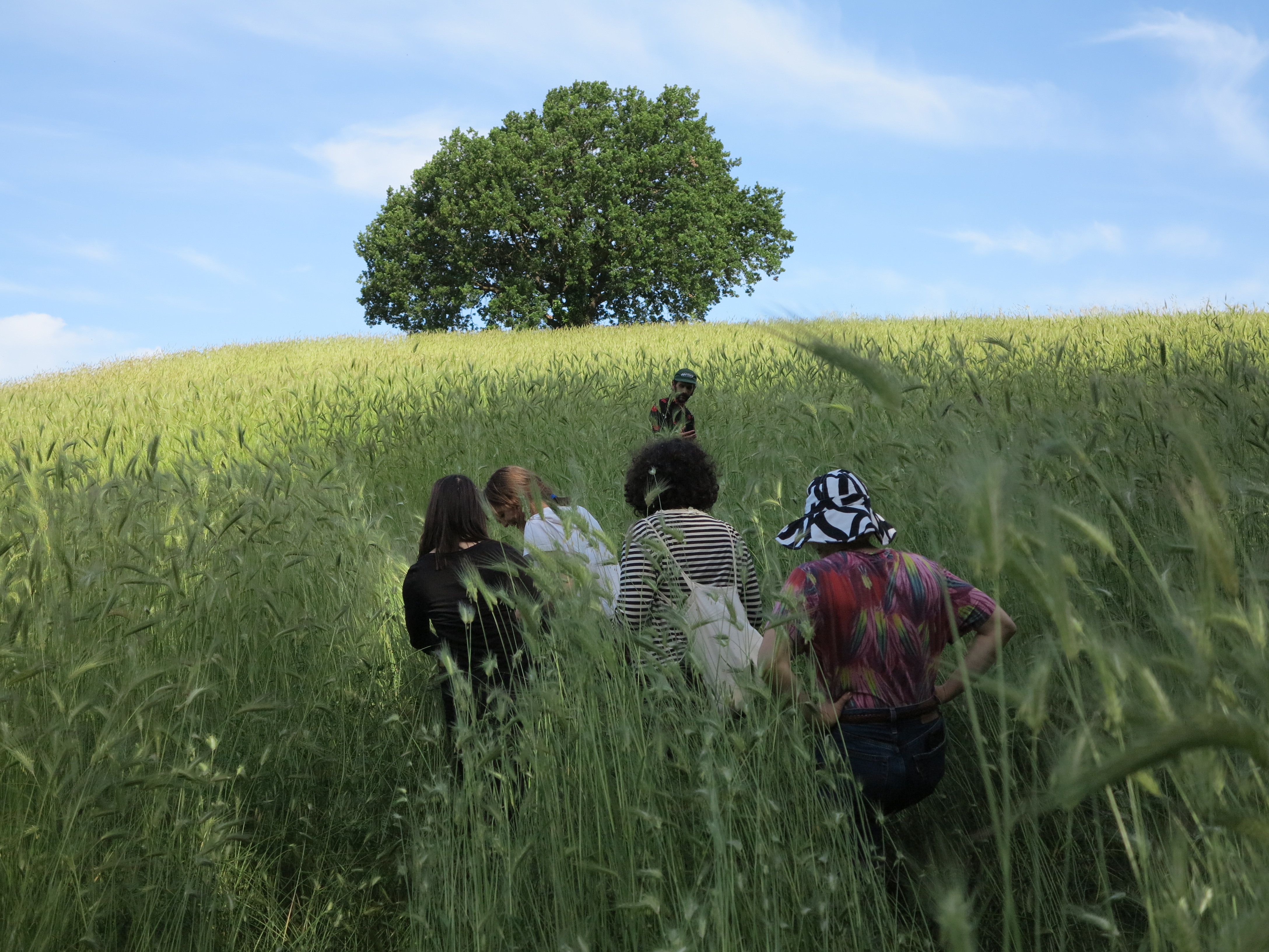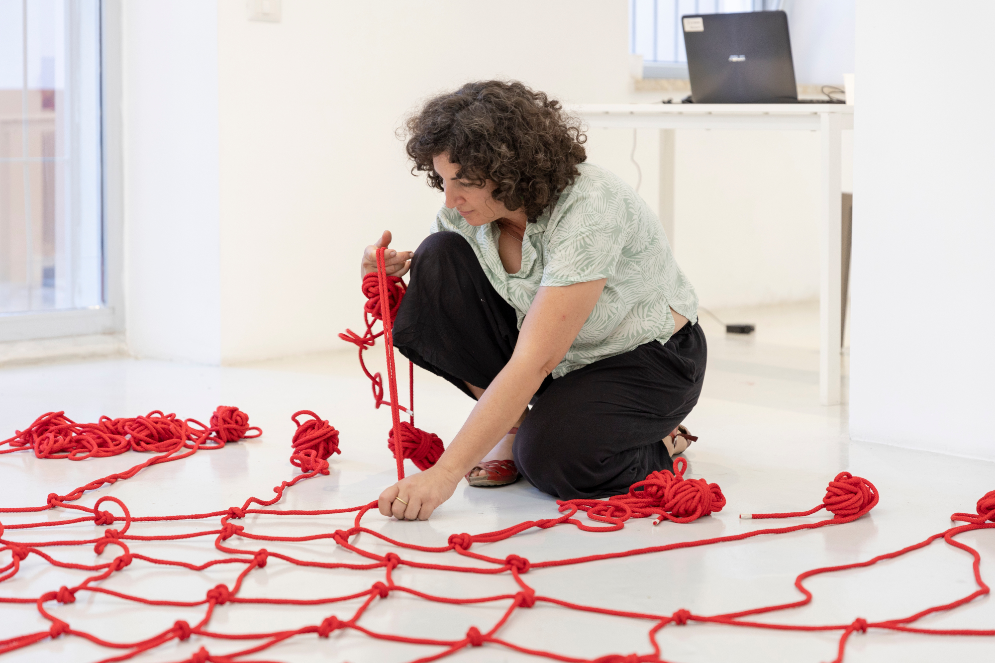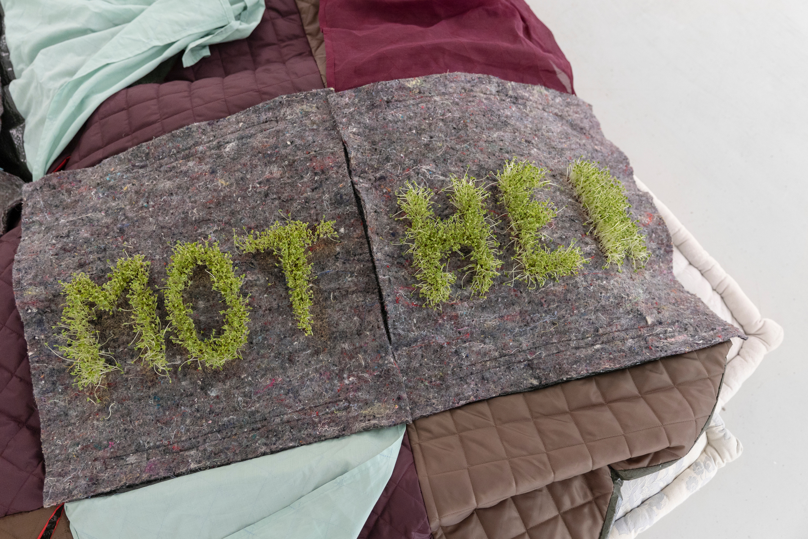 Ancora al mondo vegetale rimanda il lavoro di Sara Basta, che consiste in alcune scritture con l’erba su tela, e soprattutto in un’enorme sporta intrecciata, protagonista di una diversa narrazione della storia del primitivo umano, non tanto fondata su testosteroniche prove di forza attraverso caccia e sfoggio di armi, quanto sull’arte di raccogliere e trasportare cose, prevalentemente cibo. L’idea di Sara parte non a caso dalla traduzione del libro The Carrier Bag Theory of Fiction di Ursula K. Le Guin (1986). Infine, consistente e spessa si presenta l’installazione di Grossi Maglioni, che spinge ulteriormente la loro ricerca sulla Beast Mother, indagando in nuove direzioni che hanno a che fare con i processi di germinazione, generazione e nascita, con la terra, con la dimensione ctonia che è anche quella del profondo femminino. Operazione cui ha partecipato la brava musicista e ricercatrice sonora Eva Geist.