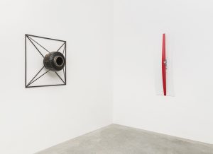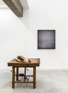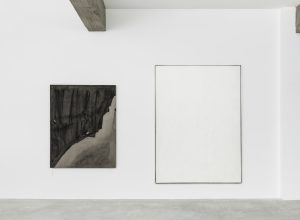 Nella parte opposta della sala sono esposte tre opere che hanno a che fare con il tema dell’assenza e dell’immaginazione, laddove l’immaterialità occupa lo stesso spazio dell’oggetto e ne completa il significato. Sul pavimento La nebbia dissolta dalla pioggia di Gianni Caravaggio, una scultura in alabastro bianco in cui forme prevalentemente tonde si alternano in un gioco di pieni e vuoti. Quel materiale è stato scelto per rimarcare il contrasto tra la sua pesantezza e la totale levità dello spazio invisibile che il marmo stesso va a definire. Sulla parete, il dipinto di Gianni Pellegrini è costituito da una sovrapposizione di strati di pittura impercettibili. L’assenza di segni porta lo sguardo a perdersi in una struttura di luci e profondità che si alternano in un supporto le cui caratteristiche fisiche appaiono al limite dell’evanescenza. Questa ambigua materialità è messa a confronto con la vicina Untitled (Hessian and Canvas) di Jodie Carey, in cui lunghi lembi di tessuto intrecciato vanno a creare un oggetto scultoreo che sfida la permanenza e la solidità di solito ad esso associate.