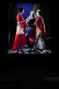 Nelle buie sale dell’antico palazzo romano si accende un percorso antologico diacronico – dagli anni settanta fino ad oggi – che compendia, con agile maestria, il coinvolgente lavoro del celebre videoartista. La cui poetica è solcata da una riconoscibile quanto inconsueta vena mistica che attinge variamente alla philosophia perennis dello storico dell’arte Ananda Coomaraswamy, alla metafisica della luce del filosofo e sufi Ibn Arabi, all’iconografia cristiana rinascimentale, ai ricorrenti viaggi in India e in Giappone. Ci fermiamo pensosi dinanzi a The Greeting, una sequenza video proiettata su uno schermo installato a parete e ispirata alla Visitazione del Pontormo. In una scena da set cinematografico tre donne si incontrano, dialogano, si scambiano un saluto informale. Con l’impiego sapiente dello slow motion, l’ordinaria cinetica dei gesti è trasfigurata fino al limite estremo della stasi.