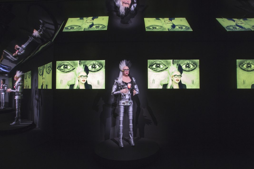 Nella sezione Action ORLAN-CORPS ritroviamo le lenzuola con le quali realizza Robe des MesuRages (1977) e parte di MesuRages, ossia un insieme di fotografie, oggetti e documenti acquistato dal Centre Georges Pompidou nel 2009. ORLAN stravolge così l’uso delle lenzuola del corredo che sono un simbolo di perpetuazione dell’ordine sociale. Le lenzuola diventano poi ampi drappeggi in ORLAN Baroque, dove ci si avvolge con teatralità e umorismo per rompere i codici della rappresentazione femminile della sposa come della santa, con un clin d’œil all’Estasi di Santa Teresa d’Avila di Gian Lorenzo Bernini. I drappeggi sono invece immortalati in quattro bellissime sculture, di recente creazione, esposte nell’atrio del museo. Vuote all’interno, il movimento leggero di pieghe scomposte, il volume come le tinte scelte (argento, dorato, nero e bianco), conferiscono loro sollenità e mistero. Piega dopo piega, queste si dispiegano con forza e dinamismo per narrare di un corpo assente. In L’Origine de la Guerre (fotografia a colori, 1989) ORLAN rappresenta un uomo con le gambe divaricate e il fallo eretto evocando il noto dipinto di Gustave Courbet, L’origine del mondo (1866). L’artista rifiuta la riduzione della donna a semplice anatomia – qui senza braccia, gambe e viso – e associa la mascolinità alla violenza e alla guerra. La scultura robotica in metallo ORLAN-OÏDE (2018), parte di un’installazione video e sonora, è invece dotata di intelligenza artificiale e collettiva. Generatore di testo e movimento – la scultura riproduce il corpo e la voce di ORLAN – questo ibrido dialoga con due volti dell’artista proiettati su schermo.
