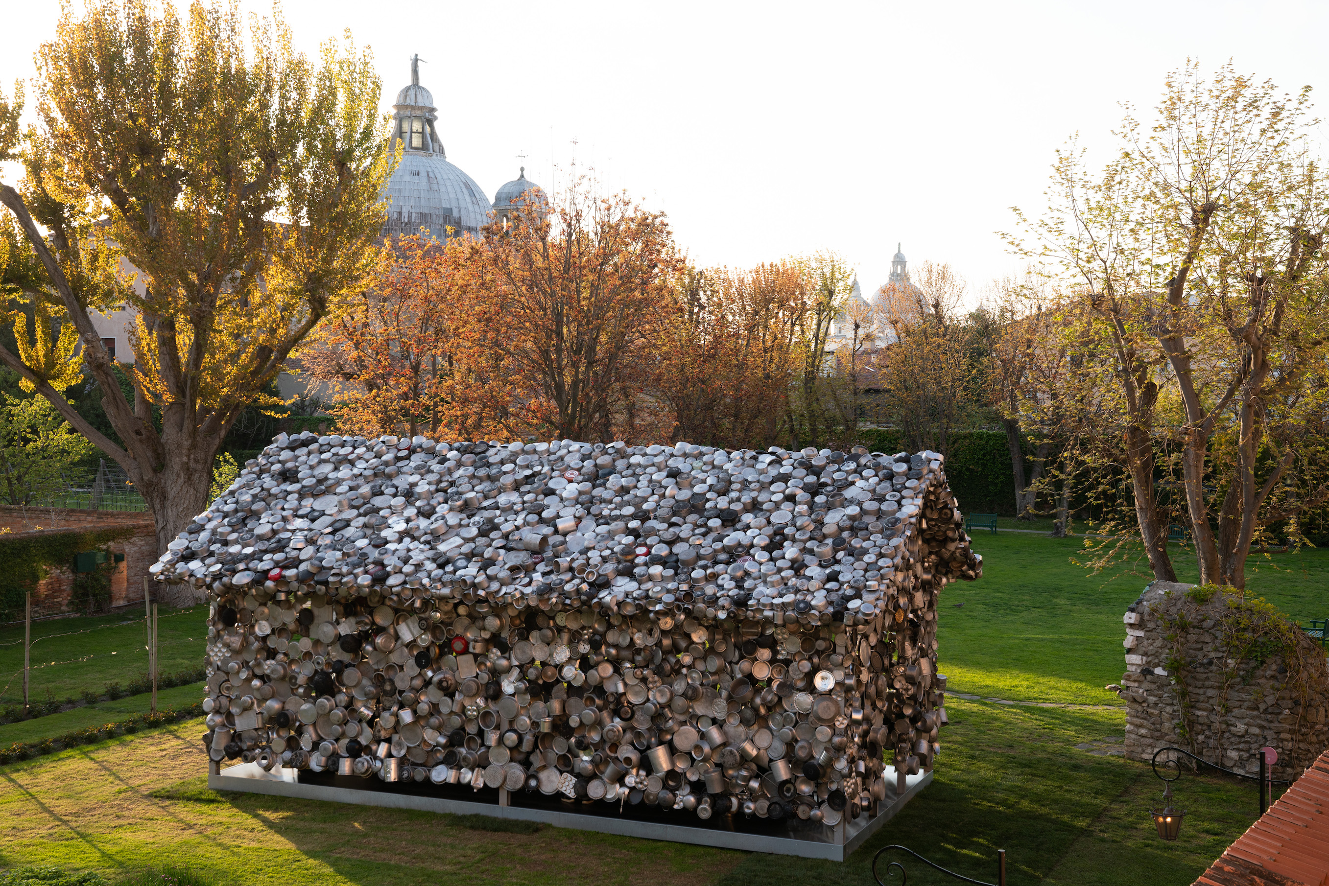 Camminando nel verde degli splendidi giardini dell’Hotel Cipriani testimoni delle scorribande amorose di Giacomo Casanova, lo sguardo viene attratto dallo scintillio di una costruzione: è una piccola casa disegnata come la disegnano i bambini, l’archetipo della casa. Realizzata però non in legno o cioccolata, bensì con quattro tonnellate di vecchissime pentole e utensili da cucina di alluminio, provenienti dall’India.