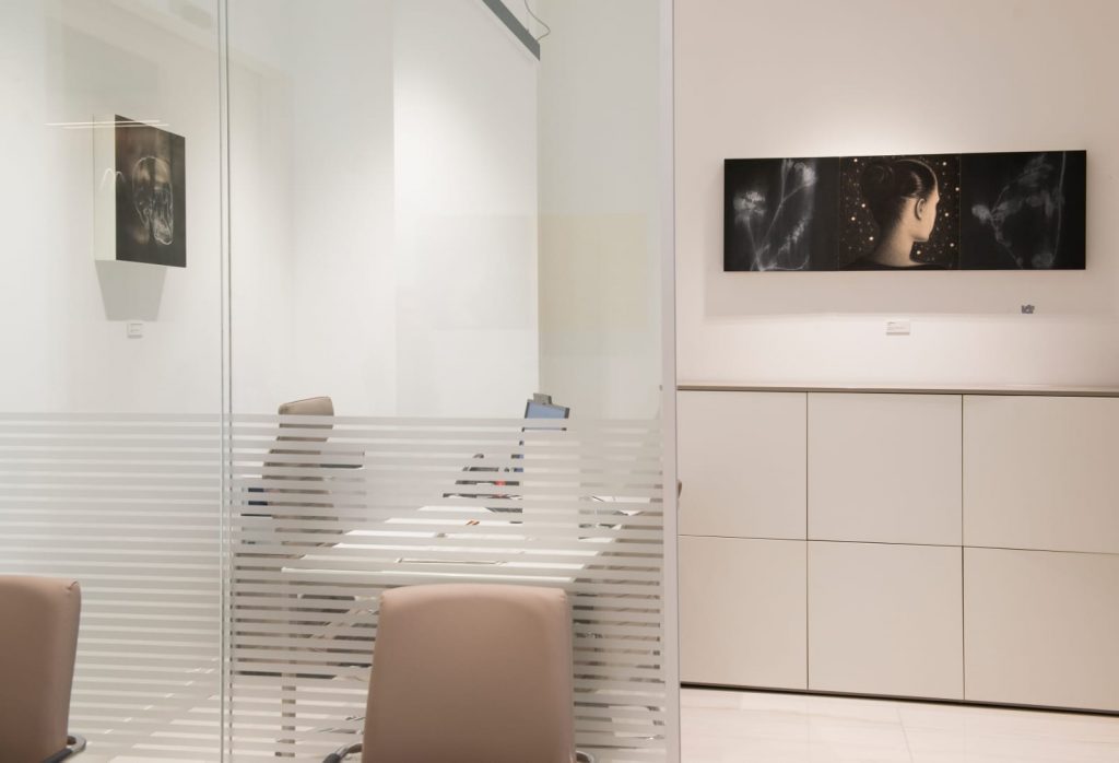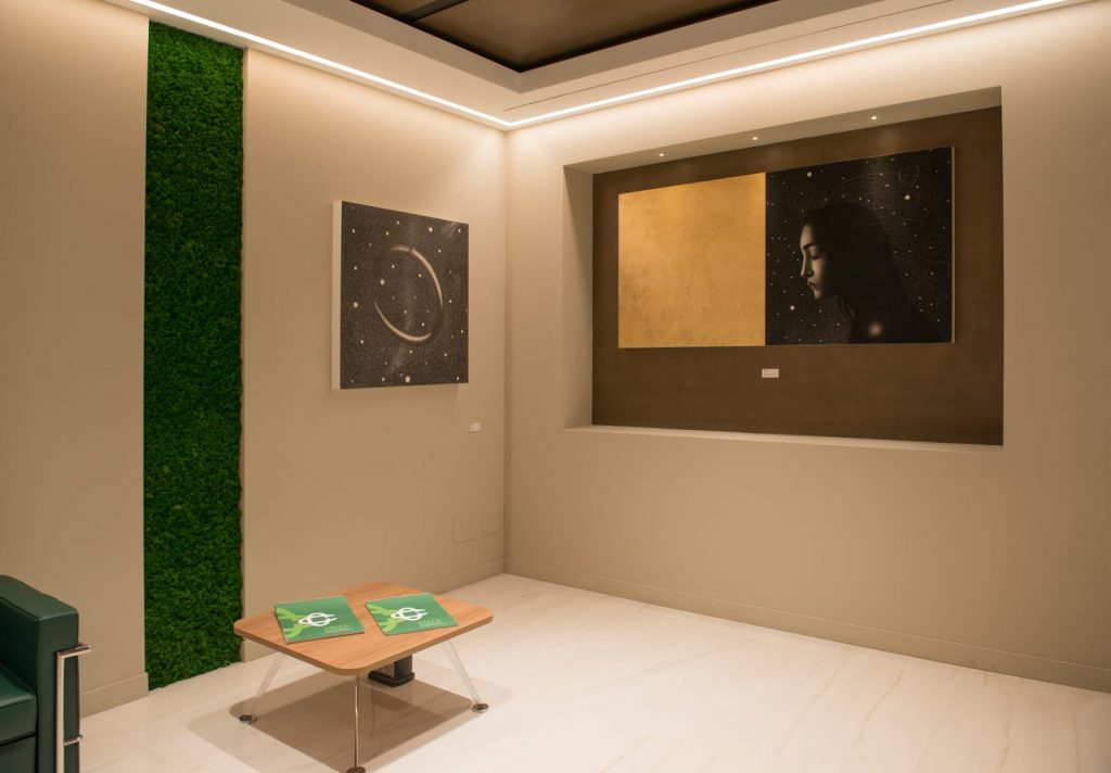 Omar Galliani non ha mai smesso di credere nel disegno come forma indipendente, capace di tenere e racchiudere in sé memoria e sperimentazione. In questa sede inconsueta, le sue opere dialogano con lo spazio in modo calibrato. Quelle monumentali invadono con discrezione gli spazi dell’accoglienza, mentre quelle più intime sono collocate negli uffici aperti al pubblico.