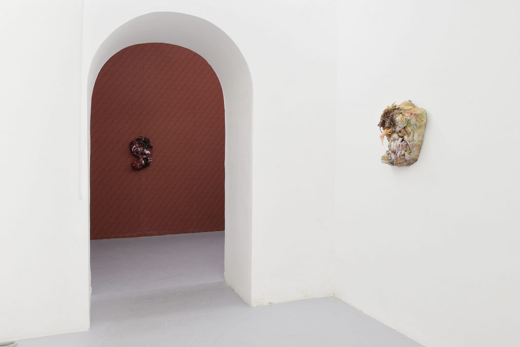 Berenice Olmedo allude al corpo mediante l’assemblaggio di oggetti trovati e strutture polimateriche, portando il corpo stesso ad un livello di alta disturbanza, in cui le funzioni vitali collassano su loro stesse. Le opere di Athena Papadopoulos sono sedimentazione di oggetti, umori e suggestioni che si conglomerano in una fisionomia respingente, come il residuo di uno scolo di materiali defluiti e accorpati da un continuum mnemonico.