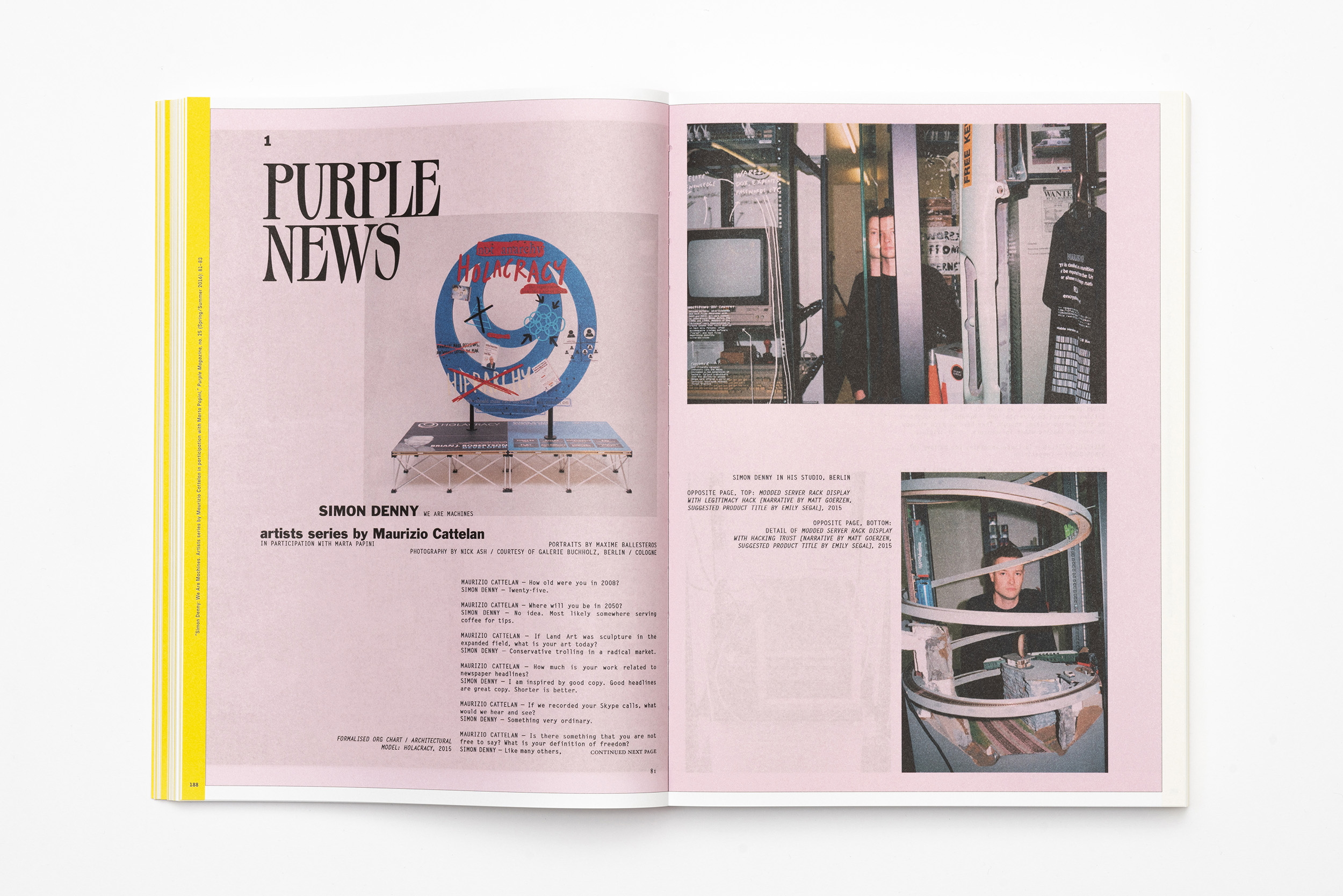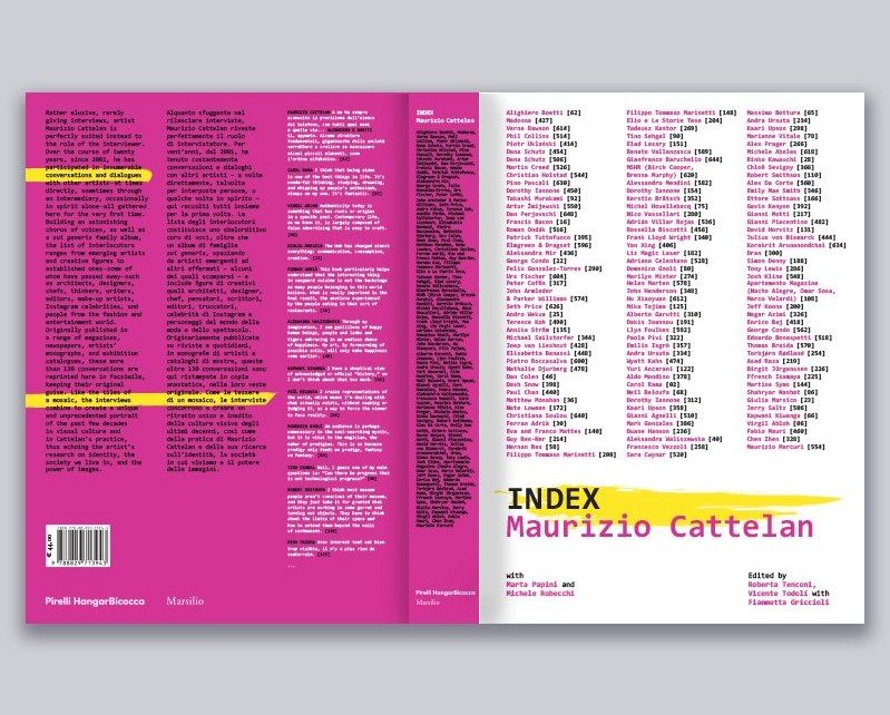 Di certo non si tratta di una semplice raccolta, d’altra parte trattandosi di Maurizio Cattelan era inevitabile pensare a un’operazione leggibile su più livelli, perché INDEX è quasi un’opera a se stante e autonomamente significante, con tutte le conversazioni riportate in copia anastatica, con testo e layout originale a comporre un caleidoscopio di voci, linguaggi – inglese, italiano, francese, tedesco, cinese – immagini e “stili”. Come un album di famiglia o un mosaico, le interviste creano un ritratto unico e inedito della cultura visiva degli ultimi decenni, così come della pratica di Maurizio Cattelan e della sua ricerca sull’identità, la società in cui viviamo e il potere delle immagini.