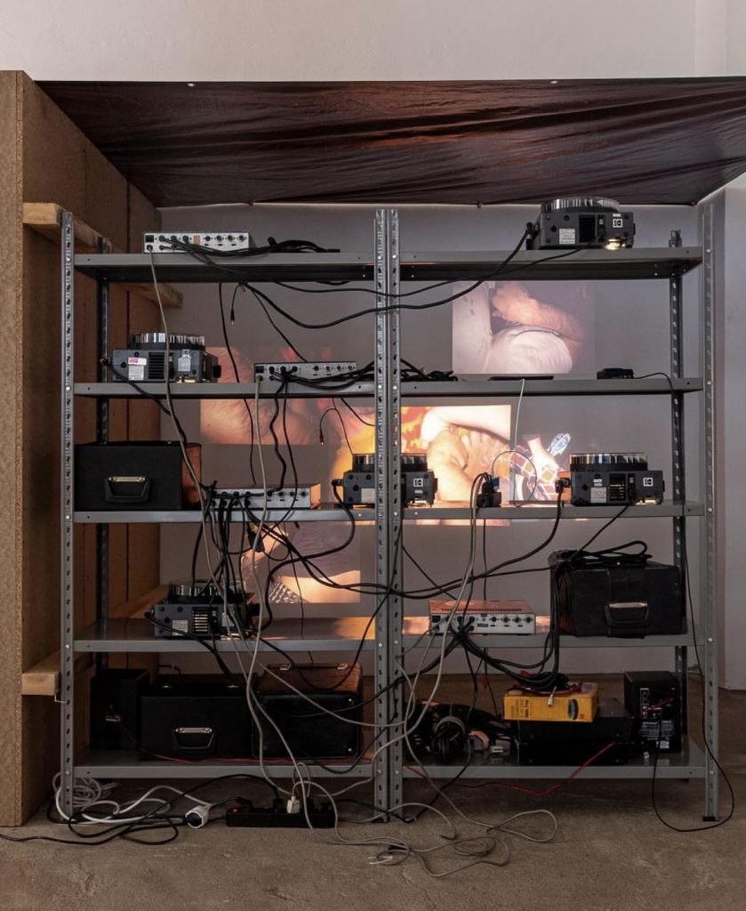 La mostra prende avvio dall’incontro con Marco Dapino, artista e videomaker autore di Ratking, un’opera composta da cinque carousel che documentano autentiche risse avvenute in varie città europee. La modalità di documentazione è ibrida, sospesa fra testimonianza e partecipazione: l’artista stesso, microfonato, è coinvolto fisicamente negli scontri, eppure rimane contemporaneamente un distaccato osservatore. Quella che potrebbe apparire una marginalità disturbante della socialità viene qui reinterpretata come una forma arcaica e viscerale di contatto, uno spazio di collisione in grado di generare legami, comunità e forse persino cura. La rissa, dunque, emerge come gesto liminale e primitivo, ma con una potenzialità generativa.