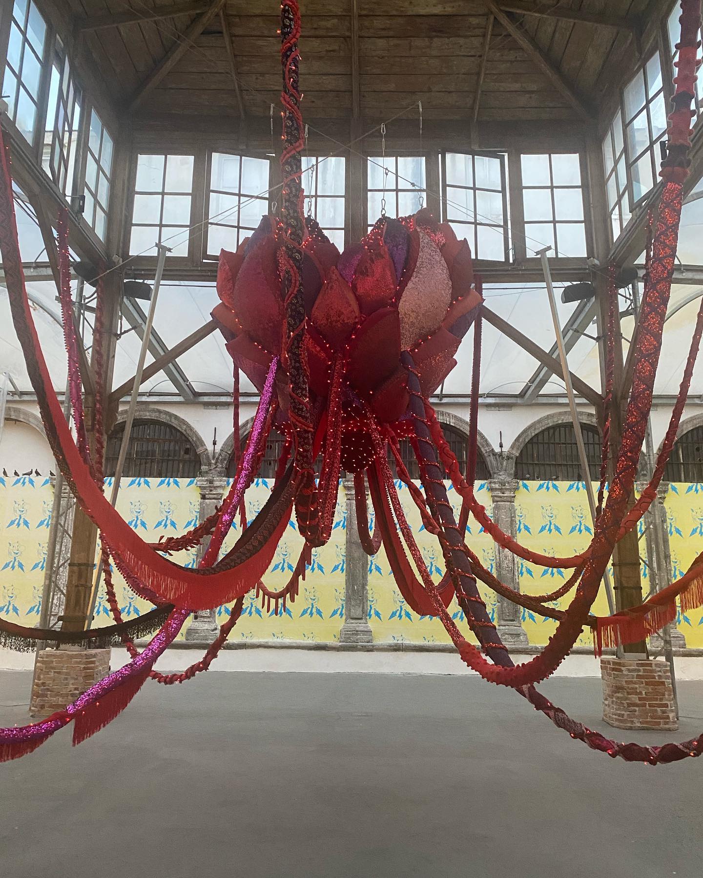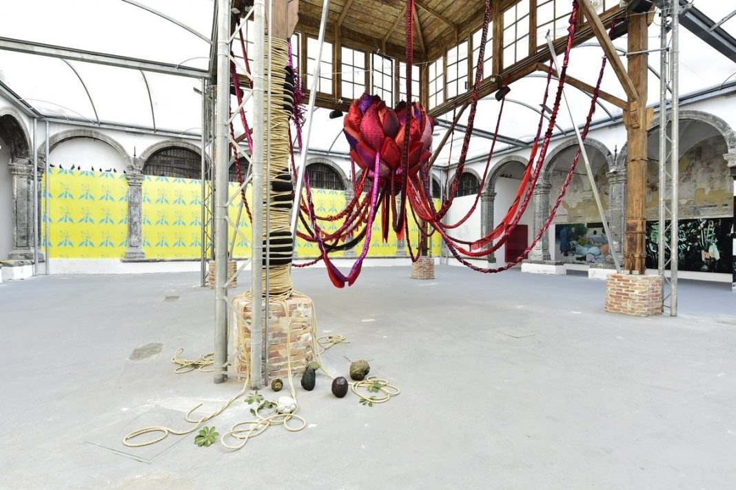 Questa mostra si esprime infatti su più livelli concettuali e visivi, emanando segnali molteplici, forme complesse e articolate, nata come è dalla collaborazione di numerosi artisti e artigiani del luogo. L’esordio, esplosivo e avvolgente, sembra risucchiare l’occhio e l’anima. Un enorme cuore di stoffa, realizzato a mano dall’artista portoghese Joana Vasconcelos attraverso un articolato lavoro di bendaggi, di pesi e contrappesi, poggiato solo visivamente e idealmente, sull’antico essiccatoio borbonico, gioiello di architettura industriale della struttura. Il tutto sembra dar pulsazione all’organismo cromatico, armonico e ambientale che gli altri 27 artisti hanno realizzato in questo magnifico ambiente.