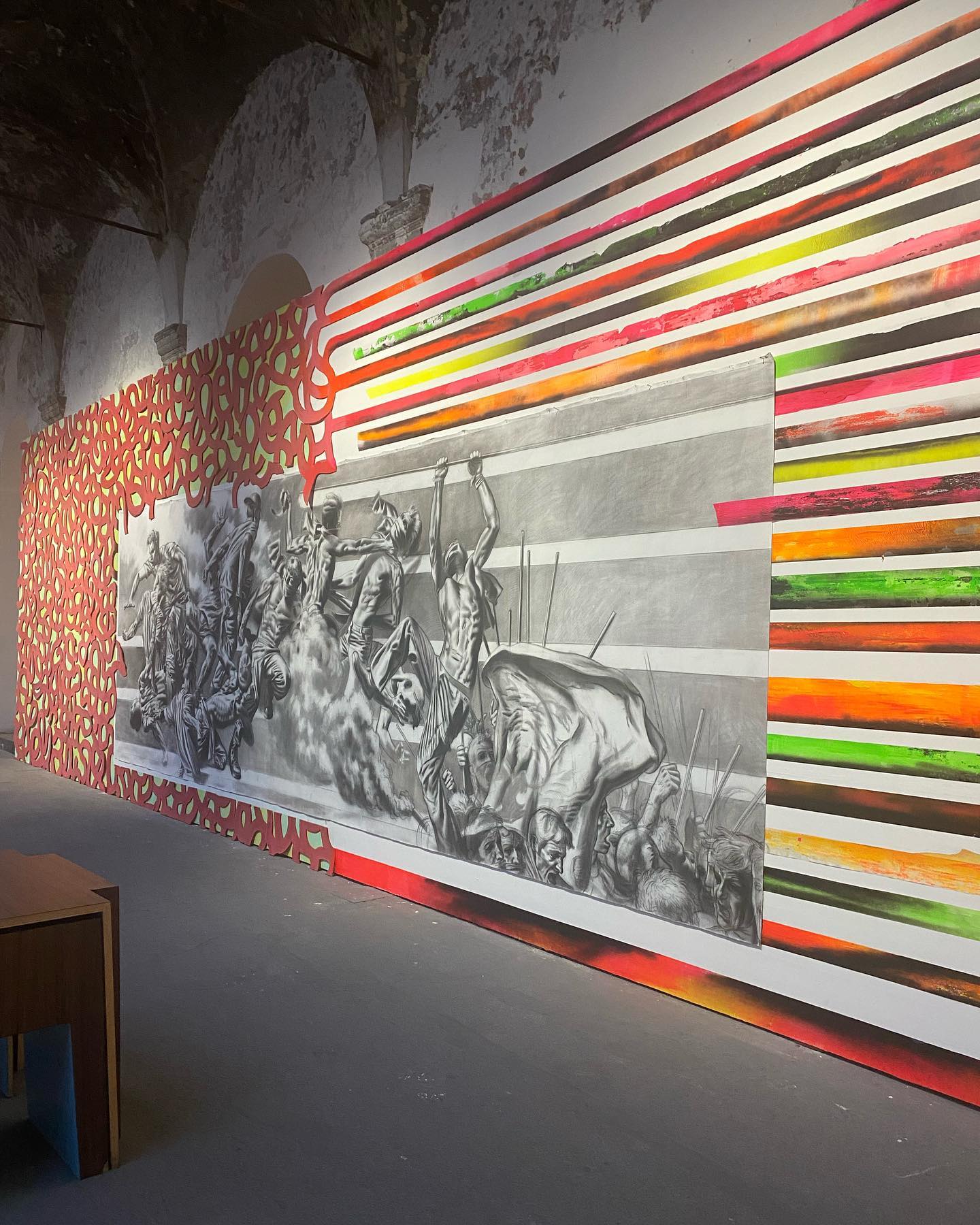 Così ecco un secondo livello di appercezione, che ci accompagna nel passeggio claustrale. Le pareti olografiche di Peter Halley, che sembrano accogliere negli stessi spazi forme simili ad antichi alfabeti o segnali dallo spazio. L’oleografia posturale e magnetica di Nicola Samorì, con la sua illusione bidimensionale prossima a una fuoriuscita dalla parete di senso e di materia. Il colore pesante, irregolare, di personalità, di Jason Martin, depositato con furore e atletismo, che racconta una sfida alla gravità, nelle forme e nei metodi di deposizione. Fino alla strisce di colore esangui di Julian Schnabel, che cancellano e compongono confini di antiche mappe dimenticate, da sempre fragili e delicate come la pennellata di un pittore.