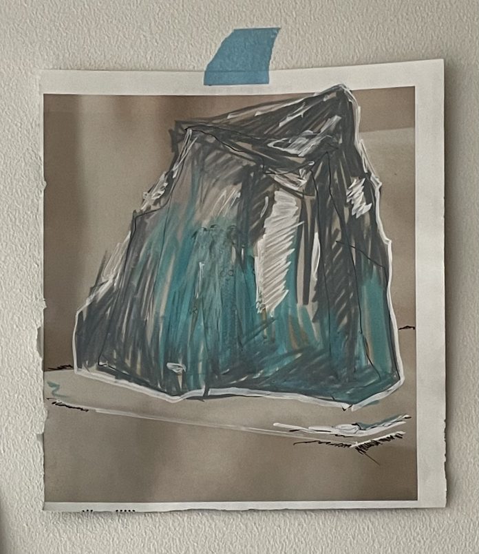 I lavori sono tutti disegni originali di una collezione più ampia composta da collage, polaroid, libri, realizzati a mano nel corso di tre decenni. La condizione di lockdown ne ha accentuato e definito l’aspetto seriale. Punctum della rappresentazione è chiaramente un iceberg, ritratto nei contesti nei quali meno si potrebbe aspettare la sua presenza ghiacciata, a diversi gradi di trasparenza. Simili agli iceberg che affondarono il Titanic o a quelli del poema di Hans Magnus Enzensberger, questi di Ivo Bonacorsi emergono ossessivamente in una successione di interni inquietanti o di situazioni insolite. Un’unica manifestazione di solastalgia in cui le paure contemporanee sprofondano non certo comodamente su un tappeto cinese.