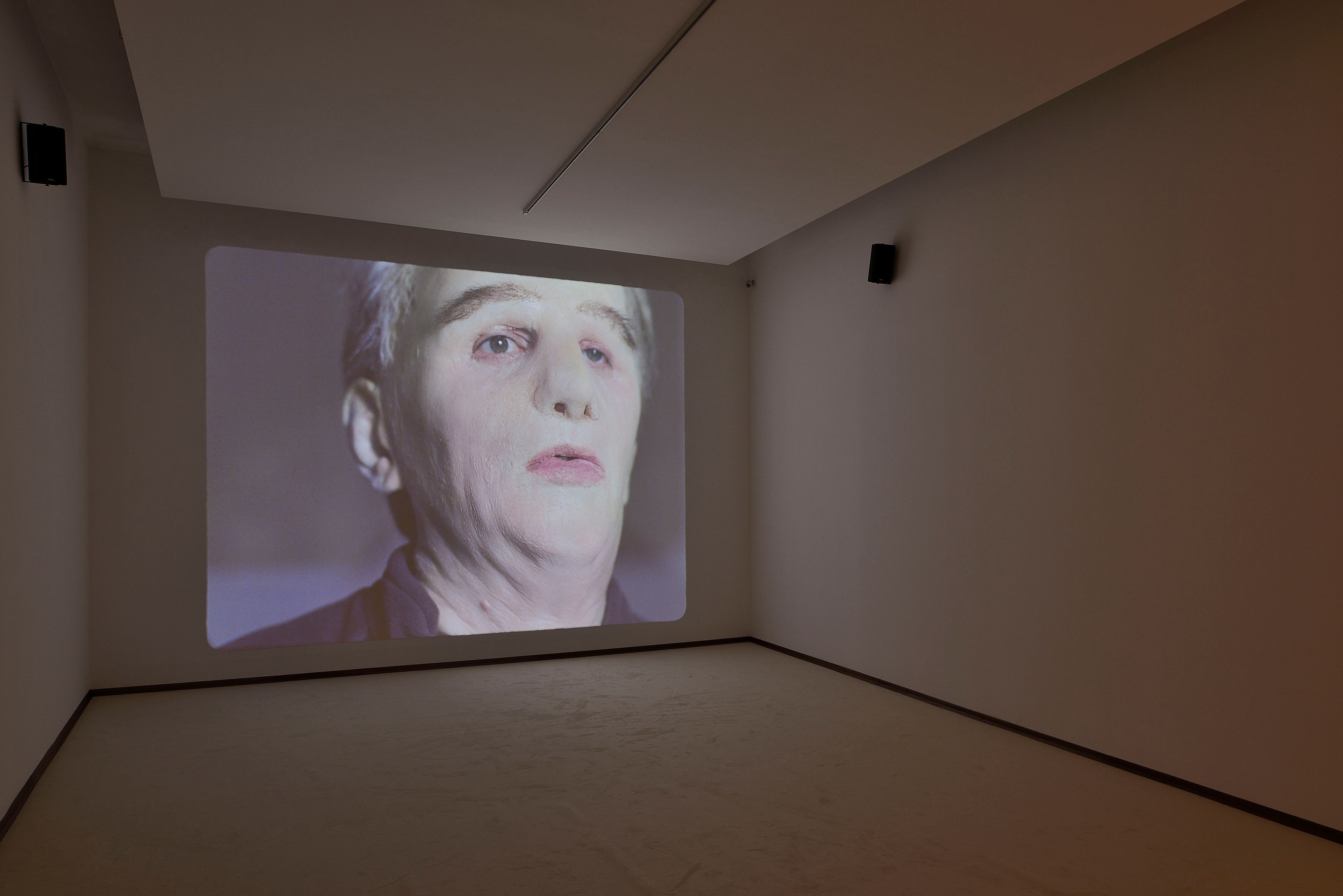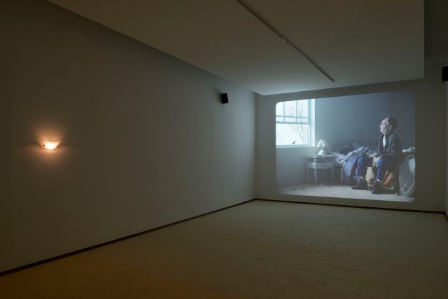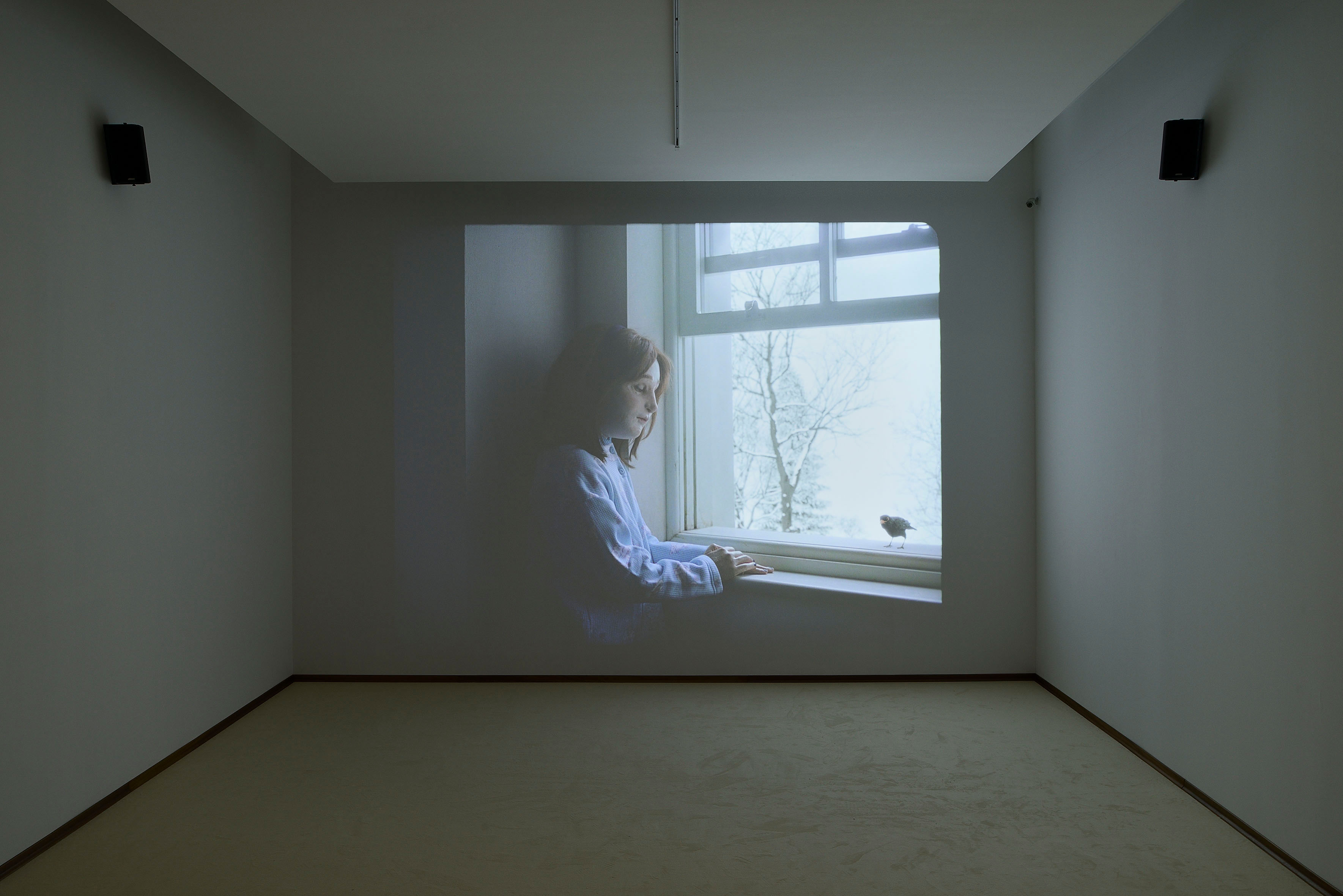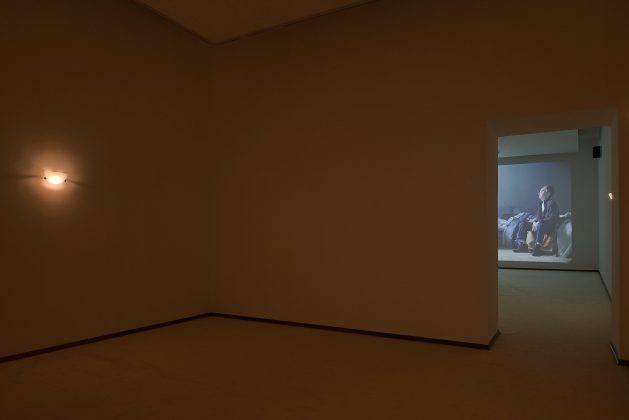 Al Madre veniamo a trovarci in un ambiente che diventa esso stesso l’oggetto della mostra, una stanza triste, con le pareti grigie come la tonalità del filmato proiettato sulla parete di fondo, dove c’è un letto sfatto, sul quale è seduto immobile un uomo dall’aspetto trasandato e con il viso coperto da una maschera prostetica. Una mano sporge dalle coperte. C’è anche una finestra aperta. Fuori cadono silenti fiocchi di neve, mentre di tanto in tanto un merlo emette un canto stridulo. L’uomo-fantoccio inizia a cantare e, cantando, racconta di avere ucciso i due suoi figli e la moglie e che si suiciderà. La musica – l’autore è Federico Chiari – ha lo scandito ritmo lento di una ballata. E in lenta sequenza appaiono le vittime: i bimbi sdraiati per terra mentre, dalle coltri scomposte, vien fuori la padrona della mano, un viso tumefatto come da percosse, un occhio livido pesto. Non c’è un’azione violenta, solo il freddo racconto di una tragedia che non è vissuta ma solo raccontata, senza pathos, con calma. Con la freddezza di un inverno nevoso che ha congelato il tempo. Niente accade perché tutto è già accaduto. La scena è ripetuta più volte. Il tempo non si ferma mai ma quello che è accaduto rimane per sempre.
