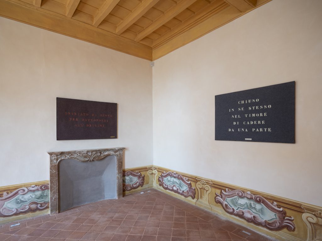 Questa drammatica opera, il ritratto concettuale della violenza, confonde tuttavia la percezione dello spettatore, che prima di chinarsi a leggere le scritte viene inondato dal familiare odore di “pulito” che contrasta fortemente il senso dell’installazione. Il senso di decadenza e morte riguarda la terza tappa, nel paese di Montemagno, in cui grande densità avviene nei Voltoni della Scalea Barocca in piazza San Martino, in cui un mobile da toilette maschile dell’Ottocento finemente intagliato convive con la scritta Untitled (No Present) di Claire Fontaine ma anche con il sound Run Fast and Bite Hard (Entre Chien et Loupe) di Marzia Migliora, una sinfonia di suoni di bosco e canti di uccelli realizzata in realtà negli studi di produzione, ovvero la morte delle nostre certezze percettive. Lo stesso senso di caducità è dato dall’opera di Latifa Echakhch in The Fall (Mountains view from Lausanne): un idilliaco paesaggio alpino viene stampato su un telo di stoffa appeso al soffitto, che inevitabilmente crolla distorcendo l’immagine.