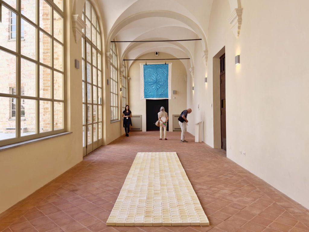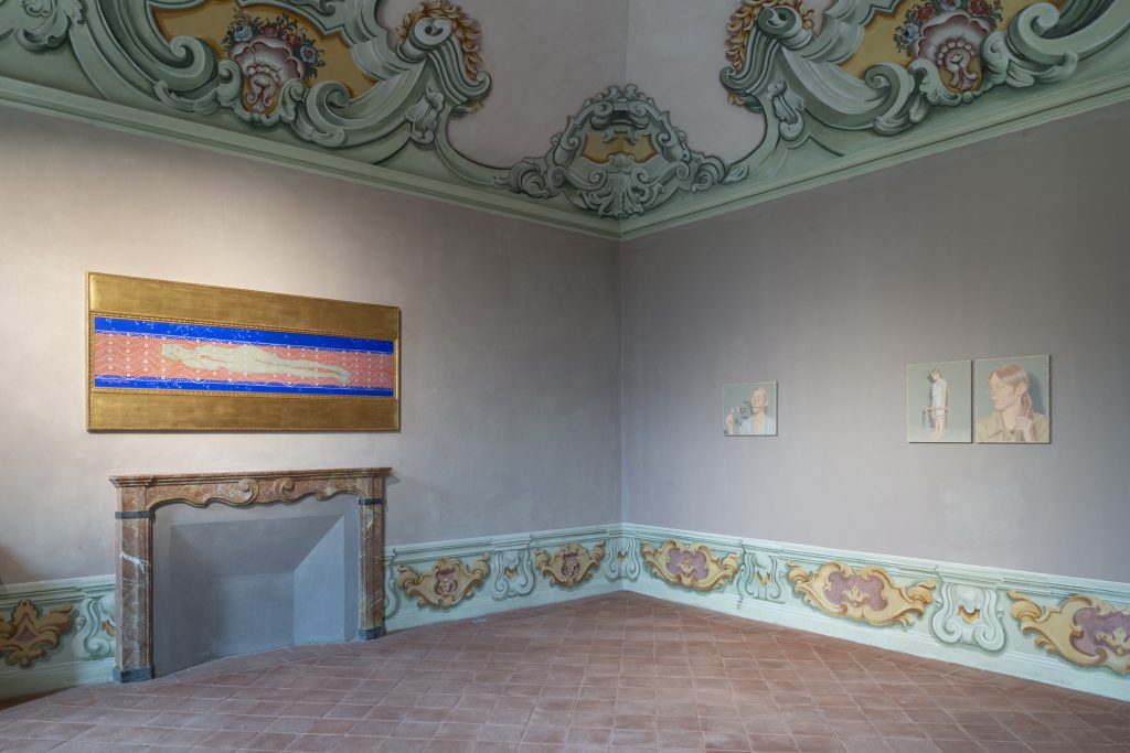 La seconda tappa è a Vignale, 20 km più a nord, dove a Palazzo Callori si svolge il capitolo Ritratto e identità. È la sede degli umori opposti: mentre al piano terra i toni sono più gravi (i ritratti degli anni Trenta di Ottone Rosai si confrontano le sculture in vetro di Diego Perrone, in cui parti di corpo e parti di macchine si mescolano in masse semi-informi) il piano nobile si apre su spazi affrescati in cui prende vita un carosello di vite, facce e identità, come la melancolia dei dipinti di Romina Bassu, i ritratti di parole di Vincenzo Agnetti, le ancestrali maschere di Edson Chagas (dalla serie Oikonomos) le monumentali memorie di Susana Pilar, la delicatezza della pittura di Alex Katz. Tra i ritratti più duri e drammaticamente struggenti però, troviamo nel corridoio che affaccia sulla corte interna Rape (2001) di Elisabetta di Maggio: posate a terra, centinaia di saponette SOLE formano una sorta di lapide in cui, a fianco del celebre logo industriale di detersivi, si alternano delle scritte incise dall’artista sulla materia porosa: sono lacrime, sangue, saliva e sperma, ovvero gli umori che vengono prodotti durante lo stupro.
