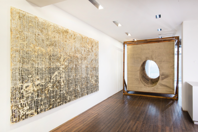 Facendo l’ingresso alla mostra, un’opera, dalla proporzioni quasi gigantesche per lo spazio della vetrina a cui è preposta, “risucchia” il visitatore nella pratica artistica del protagonista. Non a caso intitolata Entrèe dans la toile (2018 – 2022), il lavoro si caratterizza per la collocazione di dieci tele in sequenza e l’impiego del fuoco e del fumo, a formare una sorta di tunnel mediante un grande foro che le attraversa. La versione presente a Firenze richiama strutture analoghe realizzate dall’artista, ma in questo caso specifico sottolinea il particolare allestimento adottato nel percorso espositivo. Quasi a rispecchiare la prassi di Boghossian nel definire le proprie opere, che risultano infatti sempre osservabili da una certa distanza, nella loro aura magica dettata dal cinereo segno lasciato dalle fiamme, rivelandosi a poco a poco nei loro infiniti dettagli di vuoti e pieni, di colori e ombre, così si dirama l’assetto del progetto nelle sale della galleria.