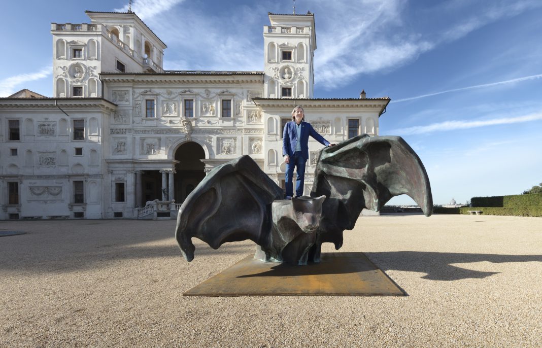Lungo la scalinata scenografica spicca il gruppo di bronzi – che sollevano una riflessione sulla nostra società – dominato dai 5 metri di The Herring, in resina. Ma ancora di più ci si sofferma davanti alla piccola scultura realizzata con i laboratori della Porzellanmanufaktur Augarten, presentata qui per la prima volta e che rivisita una porcellana della manifattura di Doccia (Ginori), scoperta casualmente da Creten. Una serie di opere in gres smaltato – i Bolders – pensate per sedersi e contemplare con un approccio meditativo cui Creten tiene molto. Da non perdere il video che precede l’entrata allo spazio espositivo e, davanti ai giardini medicei all’italiana, il bronzo monumentale De Vleermuis – il pipistrello. Siamo sul punto più alto di Roma e da qui il panorama della città eterna regala un’ulteriore emozione. “Che l’arte sia qualcosa che ci possa dare la forza e lo spirito di vivere in questo momento storico”. Parole di Johan Creten.
