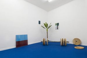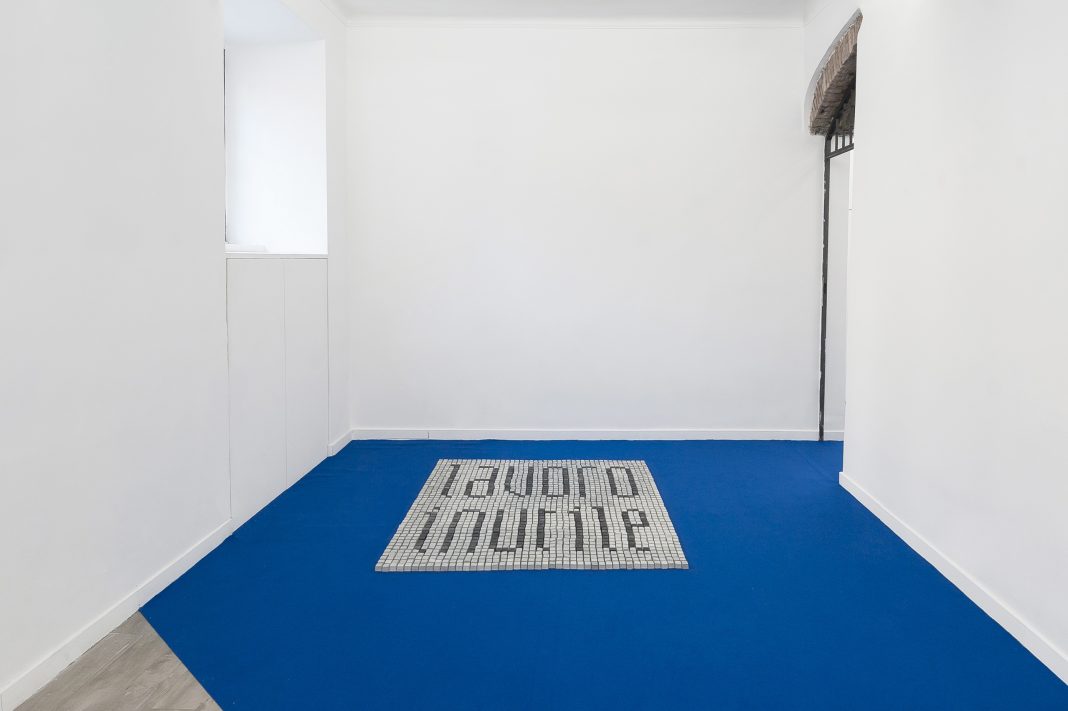 Su questa morbida superficie poggia l’opera cardine della mostra: un mosaico composto da distanziatori per la posa dei pavimenti da cui emerge la scritta “Lavoro inutile”.