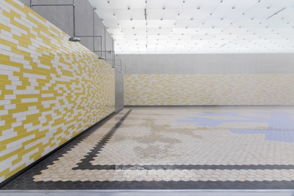 “Kind Kingdom” termina con un finale di purificazione che appare profetico alla luce del momento storico attuale. Il quarto piano del museo, rivestito di 25mila piastrelle, è diventato un’enorme Locker Room: un grande spogliatoio, simile a quelli di tante scuole e palestre. Nebbia e umidità invadono lo spazio, ci si muove sospesi, unico suono quello delle gocce d’acqua che scendono ritmicamente dalle docce. Come il momento del dolore, nell’opera di Rogers anche quello della purificazione è collettivo. Per quanto difficoltoso e perfino imbarazzante, “metterci a nudo” davanti agli altri sembra essere un passaggio indispensabile e necessario.