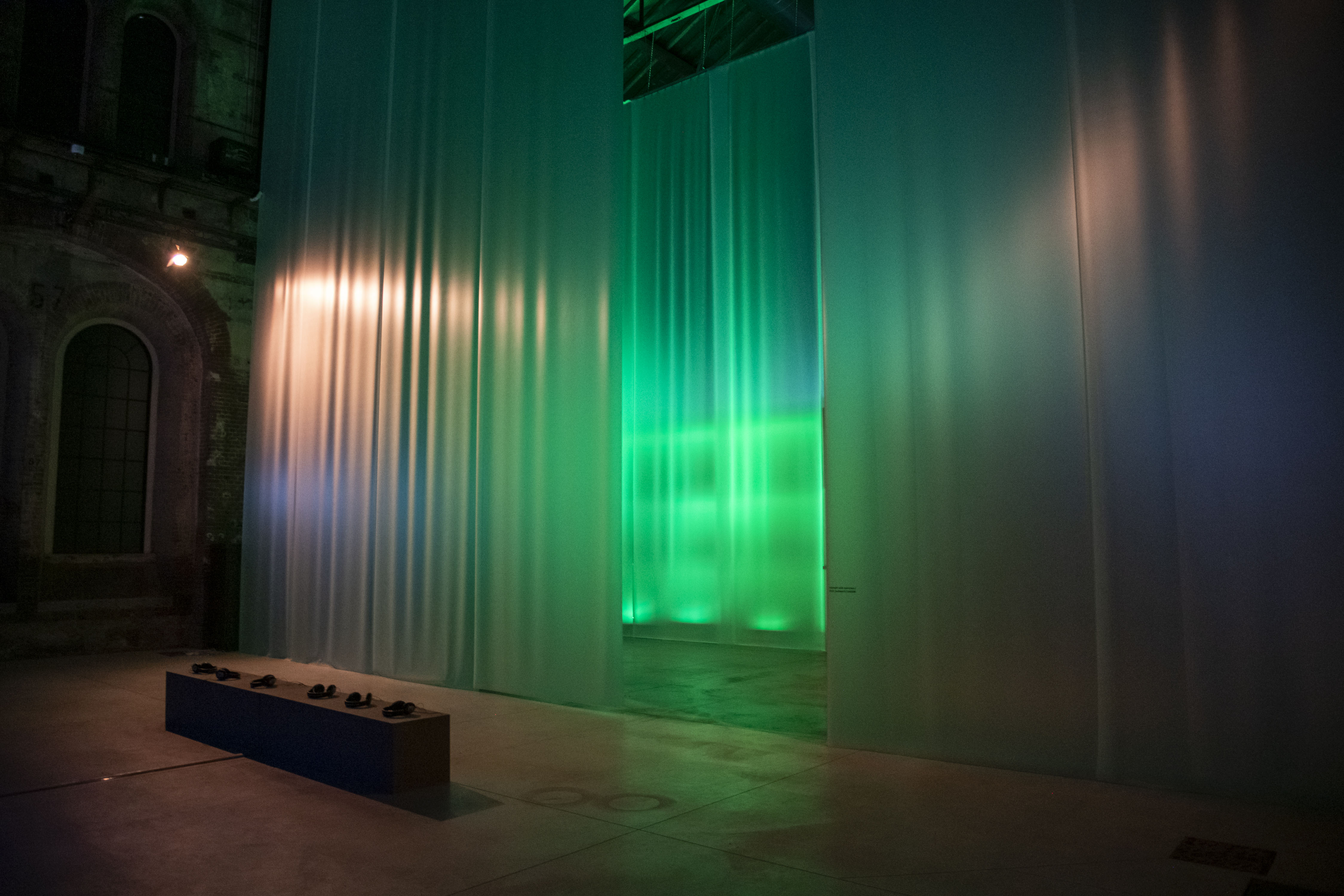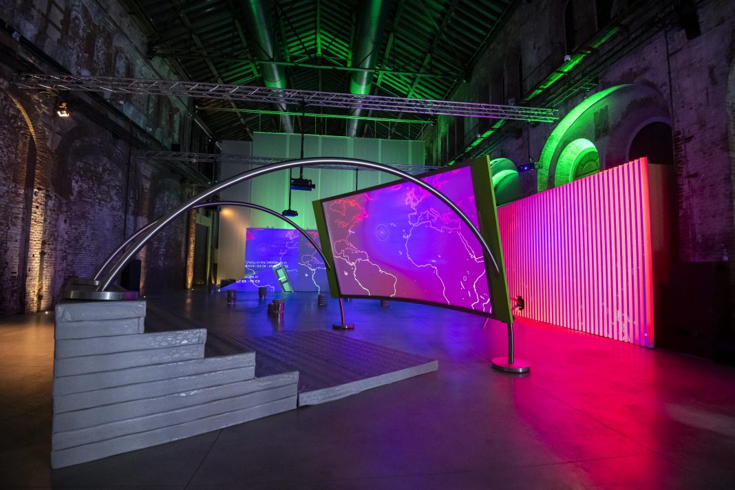 Partendo dalla suggestione di Walled Unwalled di Abu Hamdam, per cui qualsiasi muro è ormai penetrabile, le imponenti navate delle OGR sono state ritmate da un tessuto di plastica riflettente e insieme opaco che, attraverso più livelli, racconta in fondo anche la storia della pellicola. E ci permette di “bucare” (Bellini) e “corrompere” (Lissoni) lo schermo, indagine allargata di questa potente biennale.