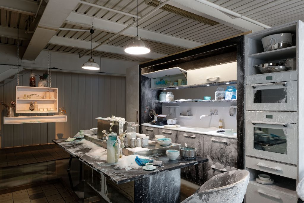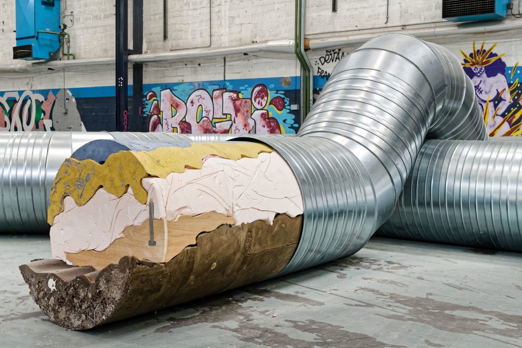 Qui il corpo dei danzatori è inglobato, a mo’ di seconda pelle, in un tessuto elastico che scende giù dall’alto – attraverso movimenti restrittivi, l’agilità delle loro membra si misura con la rigidità dell’edificio che li circonda. Non si tratta quindi di una fabbrica dismessa che serve unicamente da contenitore ma di un corpo architettonico che gioca un ruolo determinante nella concezione e nella fruibilità delle opere. Non solo archeologia post-industriale, dunque. Yona Lee presenta In Transit (highway), un’installazione piazzata molto in alto di uno dei quattro magazzini, e accessibile tramite una scala a chiocciola – una vera sfida per chi soffre di vertigini. L’artista sudcoreana ha ideato una sorta di labirinto lineare con tubi in acciaio inossidabile, che accolgono oggetti quotidiani urbani e domestici. Taus Makhacheva ha invece collaborato attivamente con 150 persone del posto per realizzare Aerostatic Experience, una mongolfiera in tessuto bianco di cotone, sulle tracce della lionese Le Flesselles del 1784. L’artista russa si è ispirata ai metodi di insegnamento del costume del liceo La Martiniere Diderot, guardando anche alle tecniche e ai materiali di epoche diverse come la crinolina – metafora per l’artista di costrizione e di protezione al contempo. Il macLyon accoglie otto artisti tra cui troviamo, al secondo e terzo piano, il duo Daniel Dewar & Grégory Gicquel con Mammalian Fantasies. Si tratta di una serie di sculture lignee di corpi frammentati di umani e altri mammiferi, che non poggiano su un piedistallo ma sono montati su mobili diversi, con risultati a volte divertenti, si va da un cassettone con conigli alle ante di un armadio con interiora umane. Si passa dal monocromo al policromo con Renée Levi che, al primo piano, trasforma pareti a colpi di pennello e spray, per restituirci un’opera astratta e immersiva, tra colore, luce e superficie. Petrit Halilaj, Jean-Marie Appriou, Thomas Feuerstein, Abraham Poincheval, Nico Vascellari e Pannaphan Yodmanee e tanti altri artisti da scoprire fino al 5 gennaio, in questa biennale magica e alchemica, fresca e sorprendente, che offre uno sguardo largo e variegato sulla creazione emergente e internazionale.