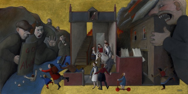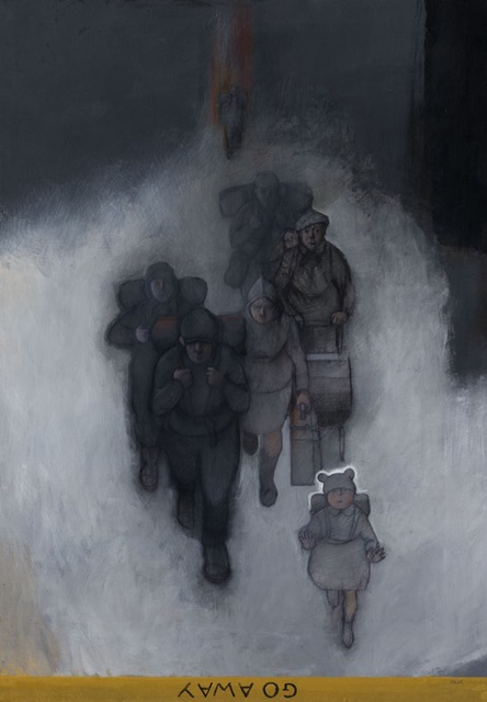«La generazione dei miei genitori non è stata la prima a cercare rifugio. In realtà sono stati i miei nonni da parte di mia madre che hanno dovuto lasciare la loro casa in Ucraina a causa della Rivoluzione Russa del 1917. Lo fecero nel 1920, quando la direzione che stavano prendendo gli eventi divenne sempre più evidente e dopo una “visita” alla loro proprietà da parte dei bolscevichi. Nel giro di 20 anni furono deportati dagli stessi bolscevichi in Siberia, su carri di bestiame chiusi a chiave. Quando nel 1942 gli fu concesso di unirsi all’esercito polacco per combattere i nazisti, furano evacuati in Medio Oriente, per poi prendere parte nella campagna d’Italia e ritornare in Medio Oriente dove i familiari erano rimasti, trovando infine asilo politico in Inghilterra nel 1948. Con una storia familiare del genere (e senza dubbio c’erano/ci sono/ci saranno peggiori) l’interesse per l’esperienza dei rifugiati era automatico. Il giocherellare con il futuro delle persone da parte di politici di cui ci fidavamo e ammiravamo è sbalorditivo. Anni fa mi venne in mente un’idea potente: nessuno di noi sa se, quando o come sarà un giorno trascinato a forza in un altro posto. Chiunque di noi potrebbe in futuro essere un rifugiato e le probabilità sono sempre stranamente alte; ma almeno ho l’opportunità di dire quello che penso davvero attraverso la pittura».