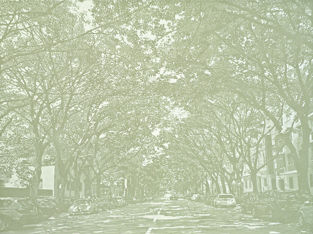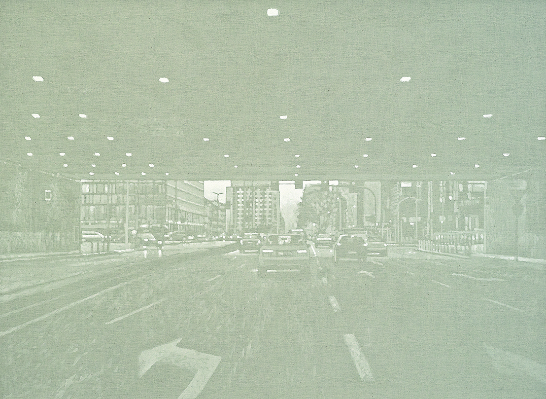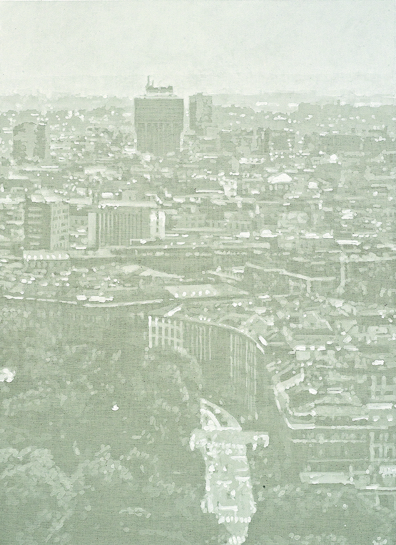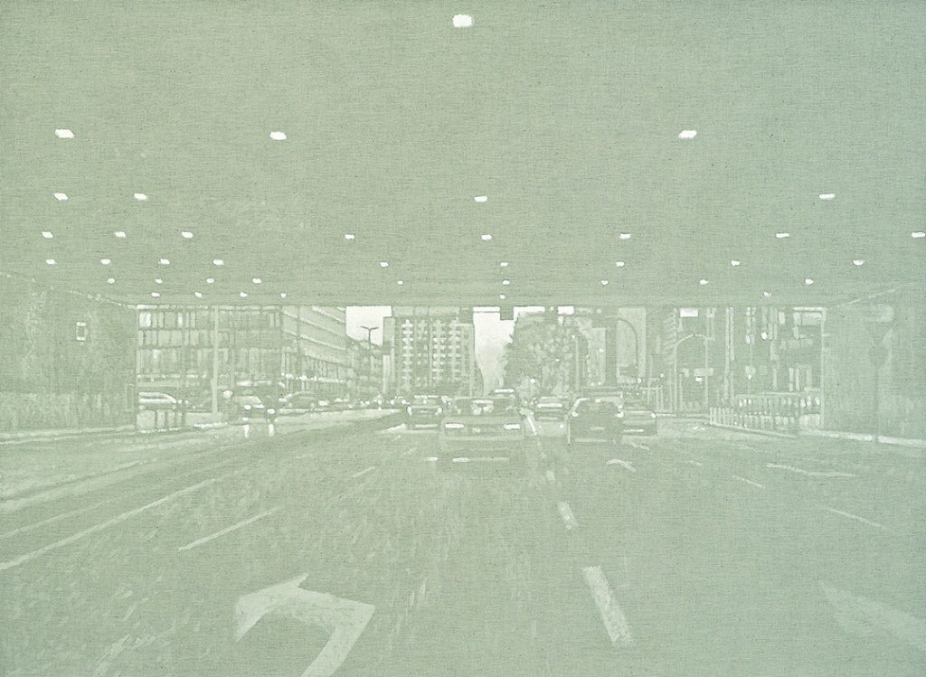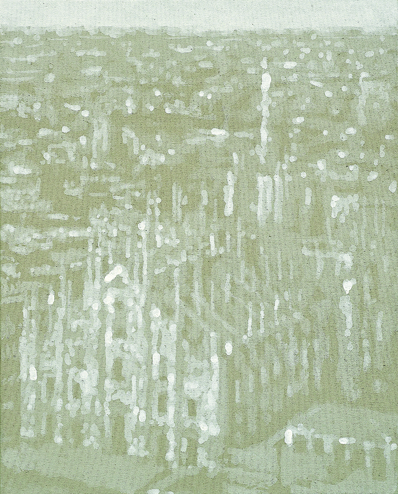 A volte il fondo emerge come un segno disegnato, a volte, come in Fuori Registro (Duomo 2), è totalmente ritmato da sottili linee di bianco, interrotte da grumi di colore che scolpiscono la facciata, immersa nella città vista dall’alto.