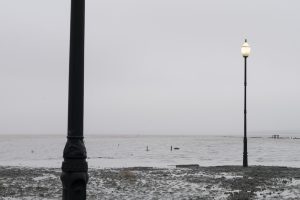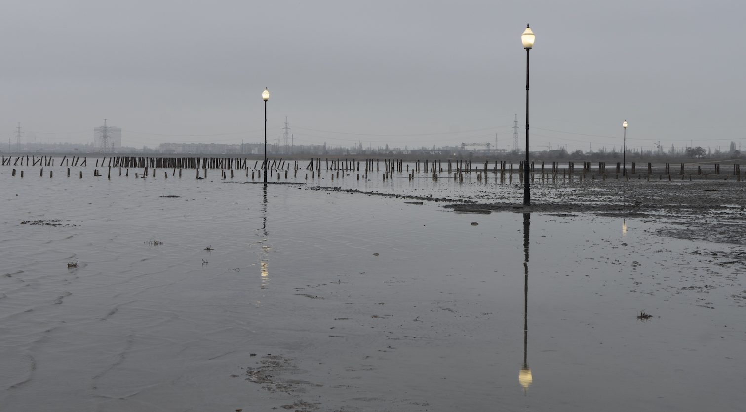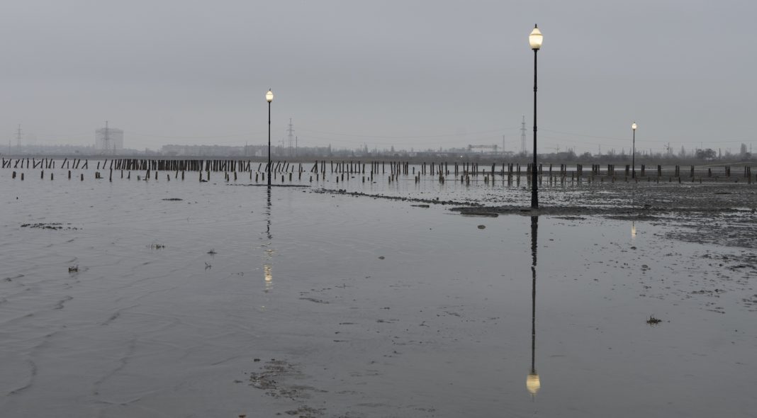 Otto lampioni stradali accesi proiettano la loro luce perlacea sulla superficie grigia del lago salato di Kuyalnyk vicino ad Odessa, in Ucraina. L’immagine è degna di Sacrificio (1986) l’ultimo film di Andrej Tarkovskij, maestro di paesaggi malinconici e desolati: un paragone che piacerebbe molto a Gian Maria Tosatti, autore dell’installazione Il mio cuore è vuoto come uno specchio-episodio di Odessa, che si è inaugurata il 14 dicembre.