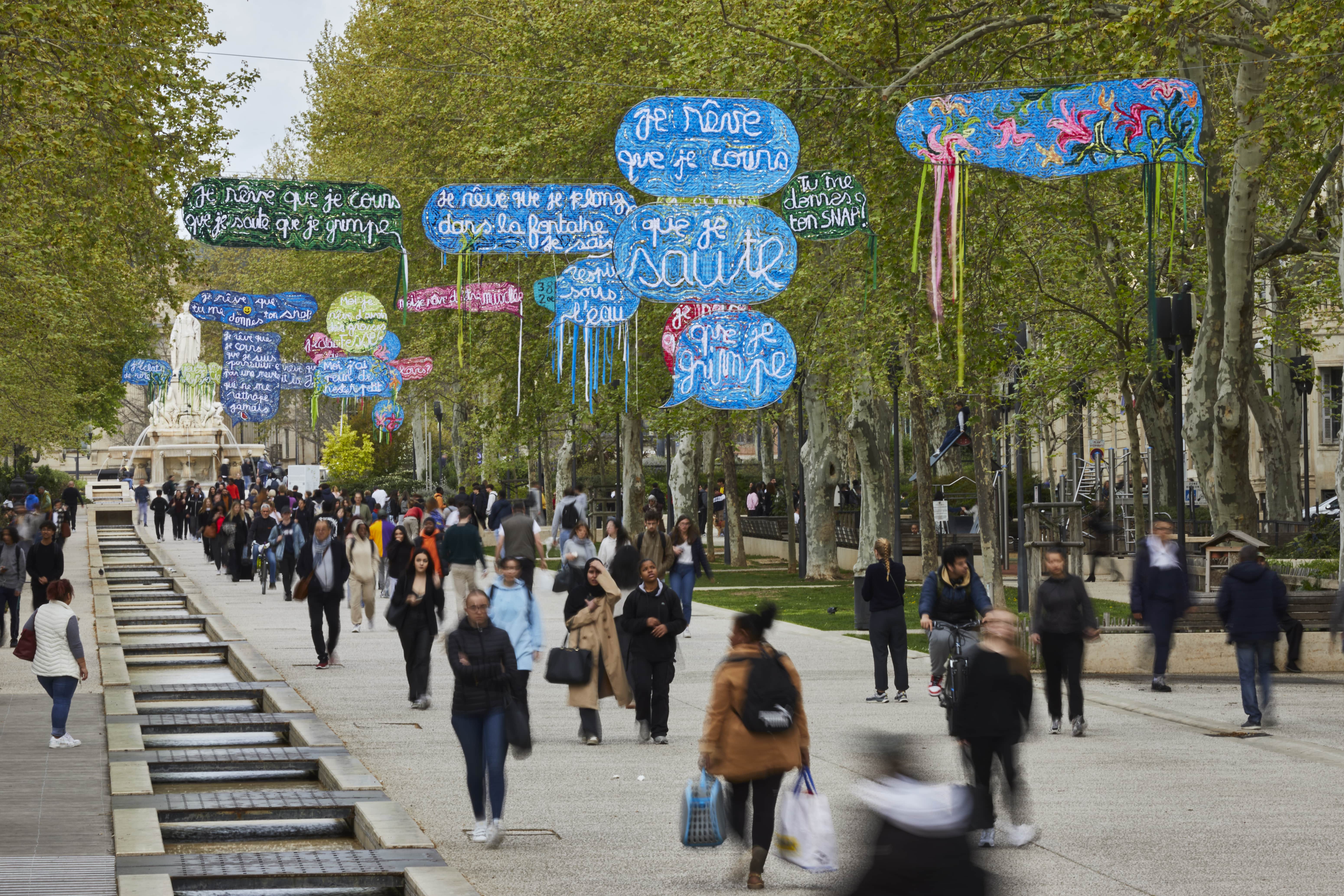 Interessante il film La Promesse di Rayane Mcirdi qui spalleggiato dal regista francese Virgil Vernier, come la scultura monumentale e interattiva, sita nella Place du Chapître, di Caroline Mesquita e Laure Prouvost per un invito al gioco e alla convivialità. Il dialogo tra Feda Wardak e Tadashi Kawamata, entrambi architetti e artisti, ha dato vita a un’installazione monumentale lignea che si disloca lungo i Jardins de la Fontaine, composta da una fantasiosa grondaia color legno che si riallaccia a un maestoso acquedotto bianco da cui fuoriesce un’esigua cascata d’acqua.