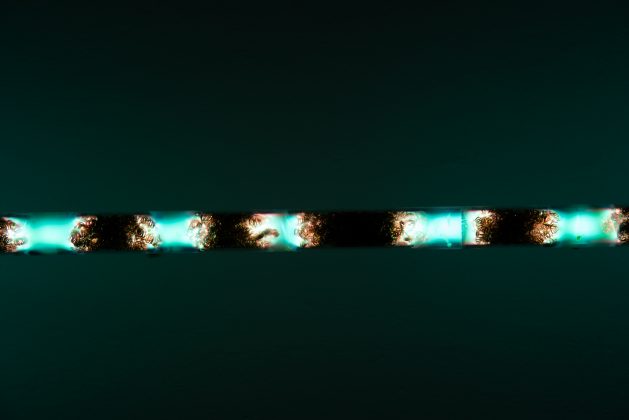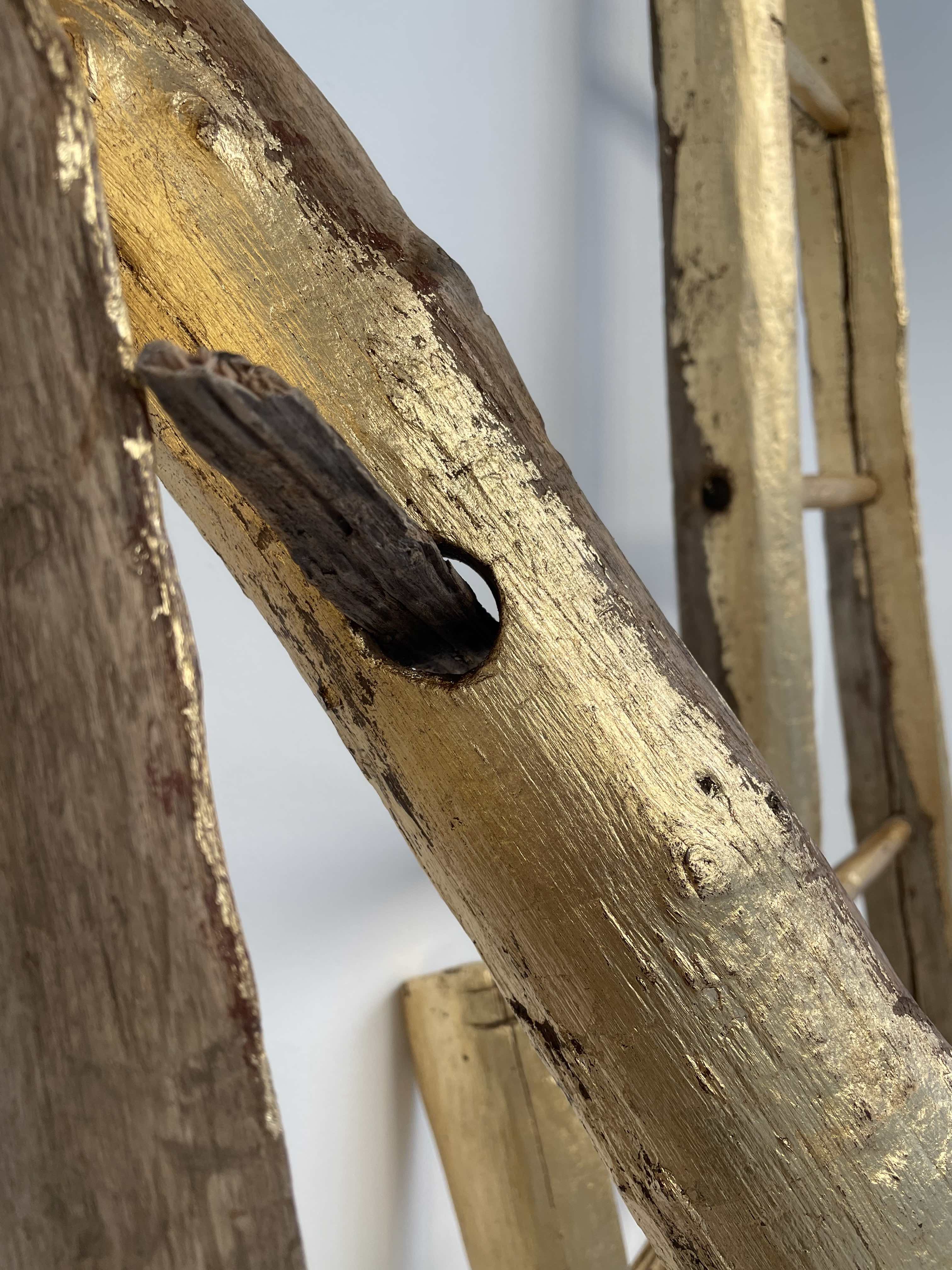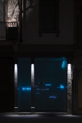 Jan Fabre ricopre la sua testa d’oro in un autoritratto con corna da diavolo, “celebrando l’anarchia tutta umana dell’arte e della vita”. Alludono all’ascensione spirituale le vecchie scale a pioli di Sophie Ko, che l’artista rivitalizza rivestendole in foglia d’oro. In questa esposizione l’oro ha assunto varie forme, da quella più astratta alla più materica, fisica. Come nell’opera di José Angelino che con Resistenze (2021) ha trasformato BUILDINGBOX in un luogo in cui si snoda un flusso luminoso nel cui percorso interferisce proprio l’oro. «Ogni cosa si ossida e si decompone, mentre l’oro rimane eternamente giovane. Sarà questo il motivo per cui ispira attrazione e bellezza?».
