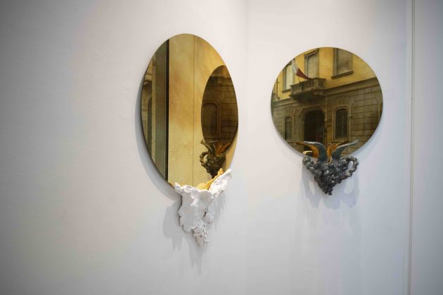 Per esempio, i Golden Works di Paolo Canevari esposti in BUILDINGBOX risalgono al 2019 e rispondono all’inquinamento visivo quotidiano cui siamo sottoposti: un silenzio dorato di fronte al frastuono di un numero eccessivo di immagini. Invece, l’oro di Emiliano Maggi ci trasporta in una dimensione fantastica: le sue ceramiche dalle forme curve e bestiali ci accompagnano in un mondo fiabesco attraverso lo specchio dorato. Antonello Viola richiama le dorature medievali inserendo la foglia d’oro in una nuova geografia spazio-temporale.