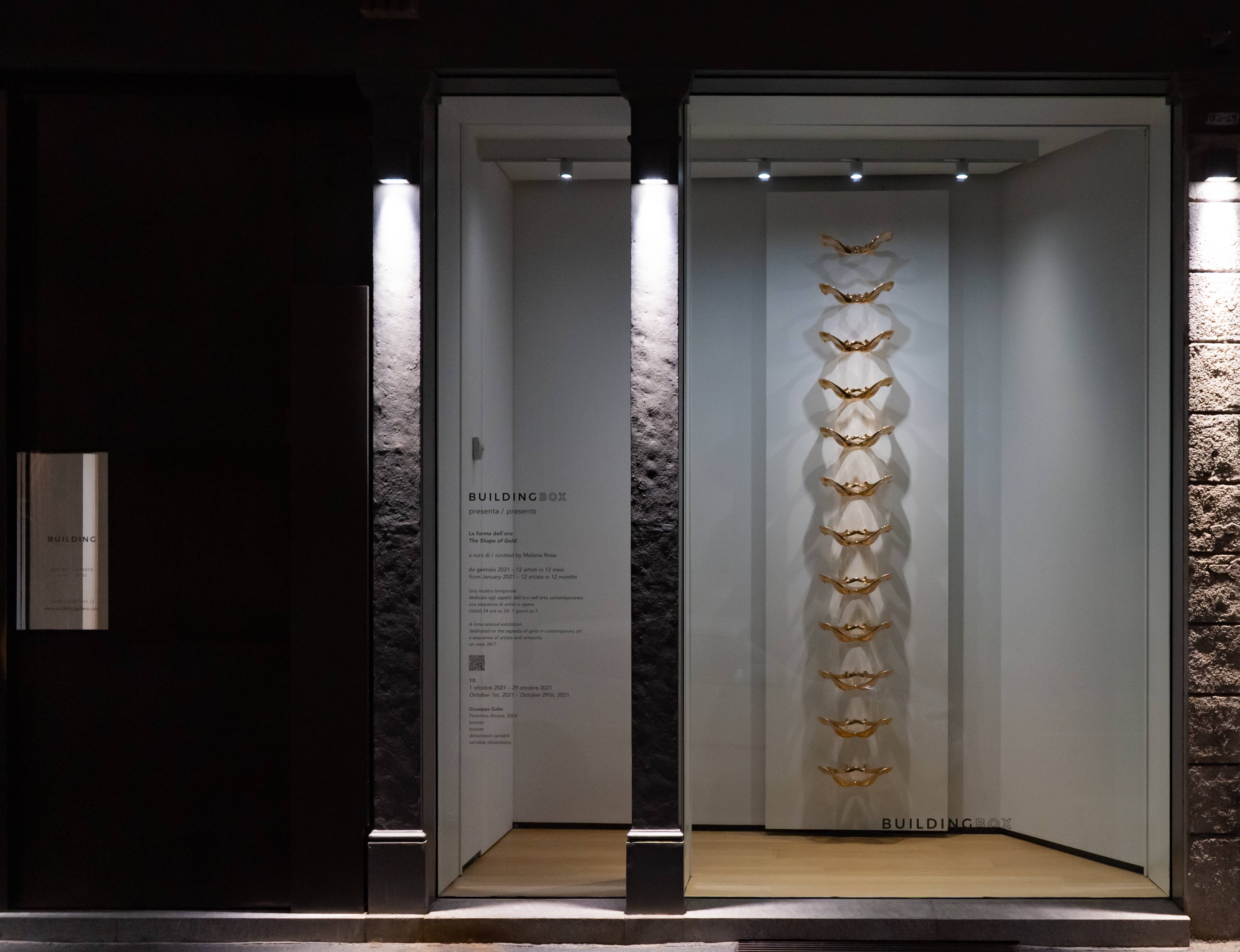 Notando come, in varie forme, l’impiego dell’oro nell’arte perduri nei secoli, dall’antichità fino ai giorni nostri, Melania Rossi ha messo insieme il lavoro di dodici artisti. Così, all’interno di BUILDINGBOX si sono alternate varie interpretazioni contemporanee di questo metallo prezioso in “La forma dell’oro”. Dodici forme dell’oro: Paolo Canevari, Emiliano Maggi, Rä di Martino, Antonello Viola, Jan Fabre, Davide Monaldi, Delphine Valli, Alex McLeod, Sohpie Co, Giuseppe Gallo, Josè Angelino, Jean Bedez. «L’oro è un colore e anche un materiale, il suo fascino è rimasto incorruttibile in tutta la storia dell’arte (…) mi sono accorta che questo materiale tornava anche nei lavori degli artisti contemporanei, perdendo la patina del passato», spiega la curatrice.