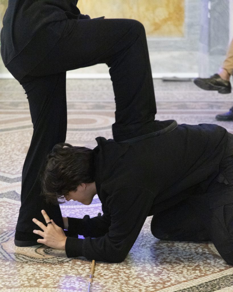 Le gambe che fuoriescono e si intravedono sembrano quasi tentacoli di un calamaro gigante, o di una medusa fortemente orticante; e proprio quello del mostro è l’elemento iconografico tipico, la firma stilistica di Atelier dell’Errore, collettivo nato nel 2002 come un laboratorio di arti visive, ideato da Luca Santiago Mora, per bambine e bambini neurodivergenti seguiti dai servizi sanitari di Reggio Emilia e Bergamo. Nel 2015, alcuni dei giovani partecipanti, ormai maggiorenni, hanno espresso il desiderio di proseguire professionalmente la pratica artistica: da questa urgenza è nato il collettivo, ormai completamente autonomo rispetto al servizio sanitario pubblico. AdE viene paragonato da Mora a un organismo vivente, all’interno del quale ogni componente assume un ruolo vitale ed essenziale, come gli organi all’interno di un corpo. Animali ed errori diventano rispettivamente unico soggetto delle opere e modalità di esecuzione: nulla va mai cancellato, salvaguardando e innescando il meccanismo secondo cui ogni “errore” diventa occasione di rinascita e metamorfosi.