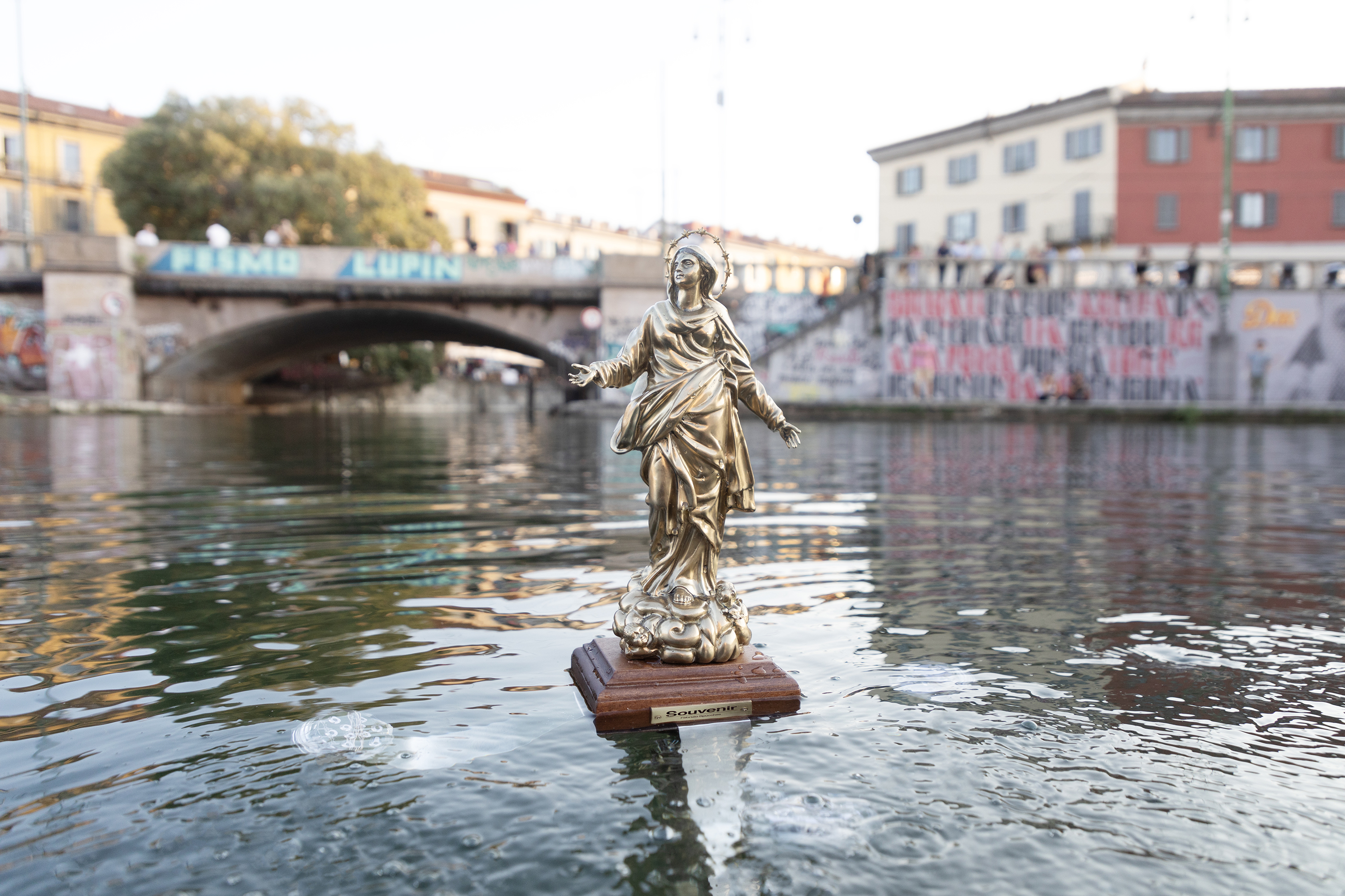 Di solito è molto in alto, anche più di quanto la vista lascerebbe intendere ma, questa volta, la Madonnina che troneggia sul Duomo di Milano, emerge dall’acqua della Darsena. Con questo progetto installativo, che sembra riportare la dimensione ultraterrena a un livello di contatto immediato con la realtà, l’artista Fabrizio Spucches vuole richiamare l’attenzione sul cambiamento climatico e sulle conseguenze drastiche di cui la città stessa si è resa testimone nel corso degli ultimi mesi.