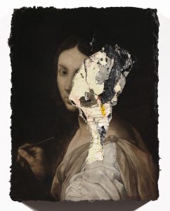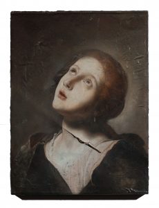 Il primo è la santa di Immortale (2018) che ha la gola squarciata da un pennello vero, che coincide con lo squarcio profondo della carne della pittura che arriva alla tavola: una metafora in cui lo strumento del pittore è in grado di operare una profanazione dell’immagine. Il secondo è Anulante (2018), un olio su rame, dove Samorì squarcia come in un’operazione anatomica il tronco del personaggio e lo apre in due per mostrare la carne sanguinolenta e ribollente del corpo della pittura. Il terzo esempio è Lienzo (2014), olio su tavola. Anche qui l’artista ha costruito uno spessore scuro con un denso strato di olio sul quale ha dipinto con pennelli finissimi il corpo perfetto e classico del Cristo nel sudario da Philippe de Champaigne, ma poi ha tolto con una grande concentrazione la pelle superficiale della pittura, arrivando esattamente a metà del corpo diafano del Cristo: una coltre nera e profonda incombe sulla figura e la fa galleggiare per sempre nel tempo.