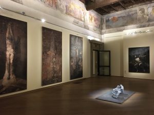 “È pittura che guarda la pittura” afferma l’artista, proprio come fanno in modo programmatico tutte le figure dei suoi dipinti installati nella Sala, che guardano verso l’alto.