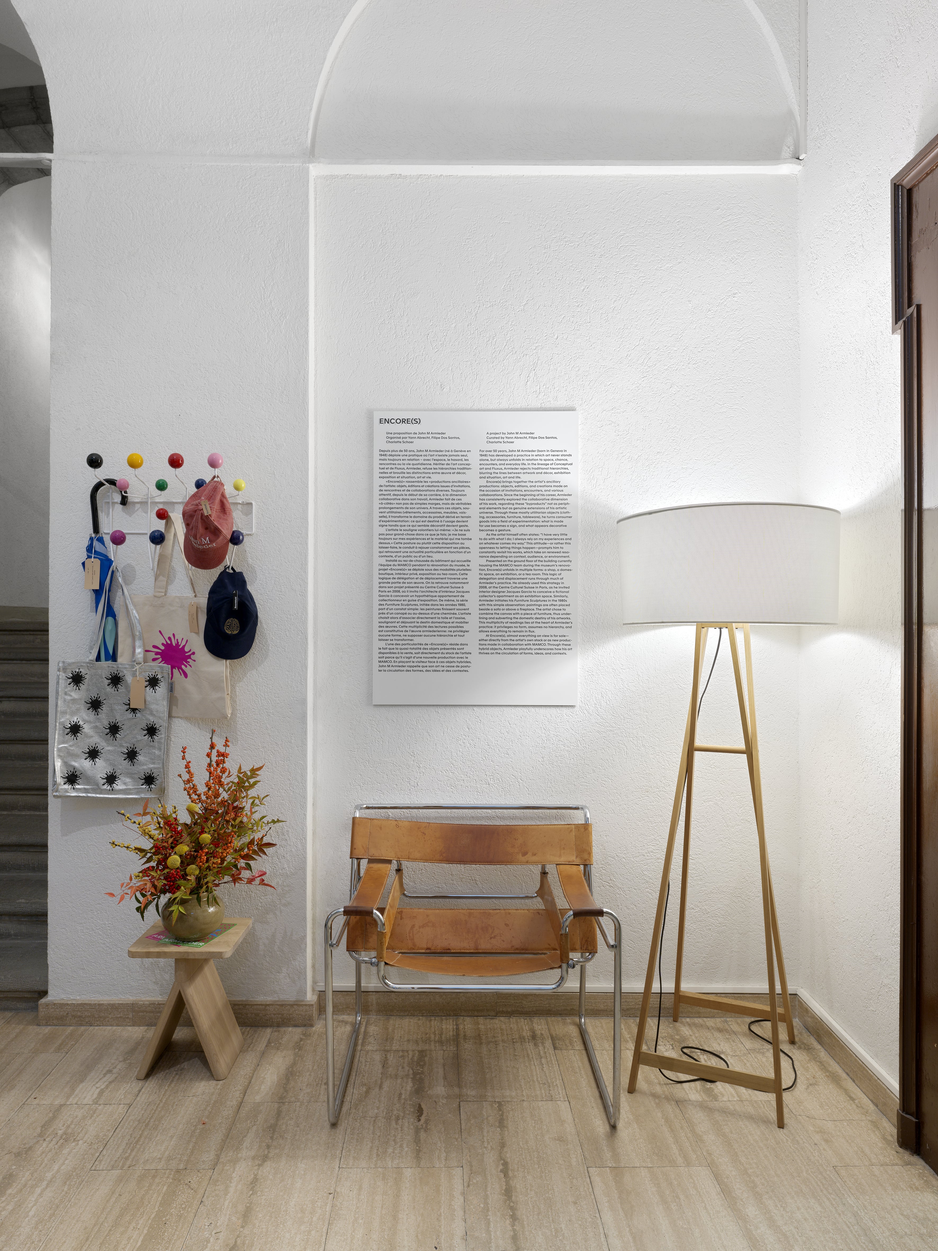 Nella sede distaccata del MAMCO di Ginevra, due stanze raccolte – che ricordano l’intimità di un appartamento arredato con cura – sono colme di ogni “ben di Dio”, frutto della poliedrica produzione di John Armleder e di un’accurata messa in scena dello spazio. Dalle etichette delle bottiglie di vino al servizio di tazzine Illy, dai libri disposti nelle minimali librerie Ikea alle magliette e felpe sistemate su un porta-attaccapanni da grande magazzino; dai colori a matita con i nomi degli artisti stampati sopra e sul foglio del contenitore – The 30 Americans Crayon Edition -, fino alle lampade e ai mobili di design – sedie, poltrone, un divanetto – tutto concorre a definire un ambiente densamente abitato da oggetti.