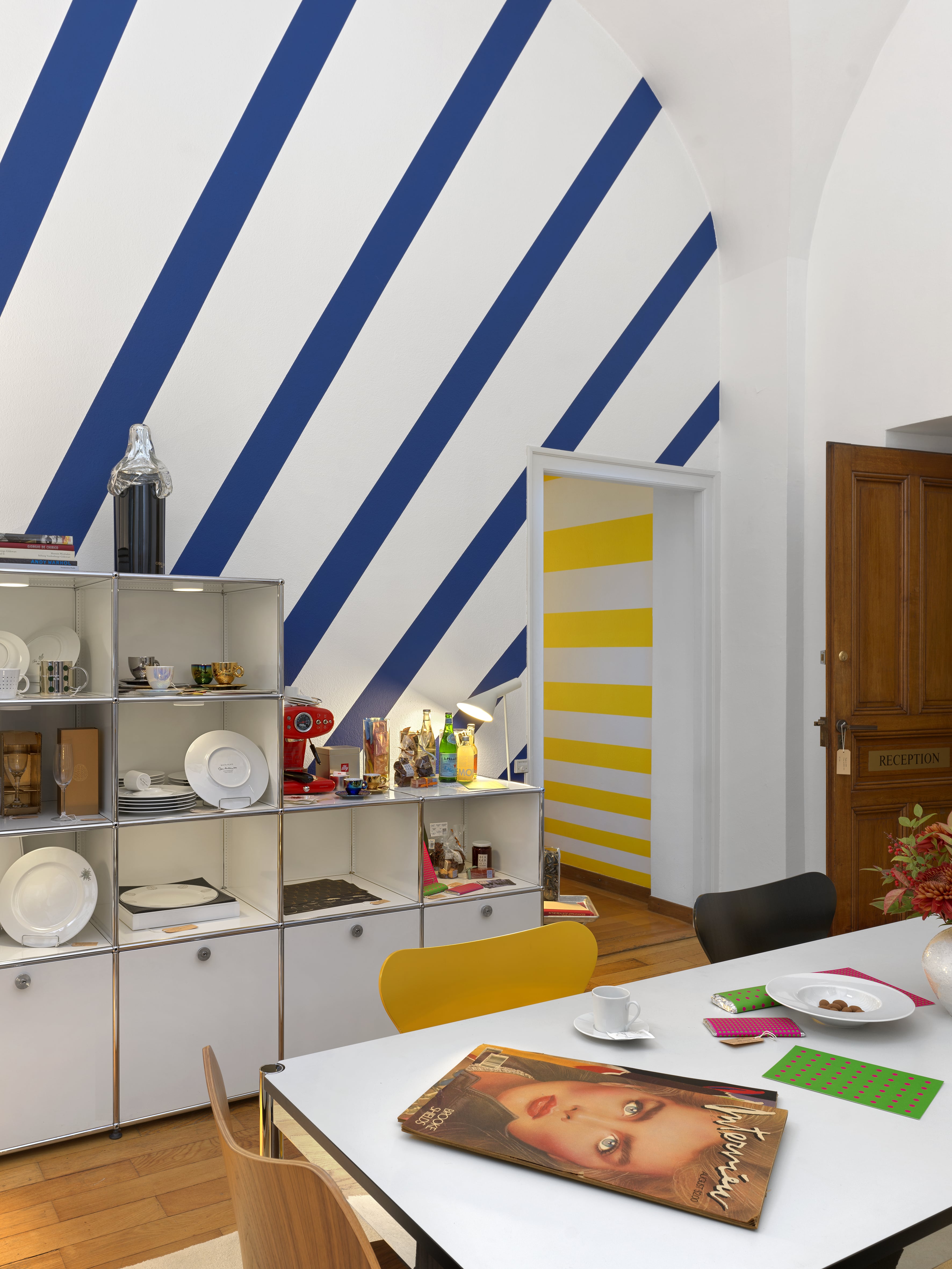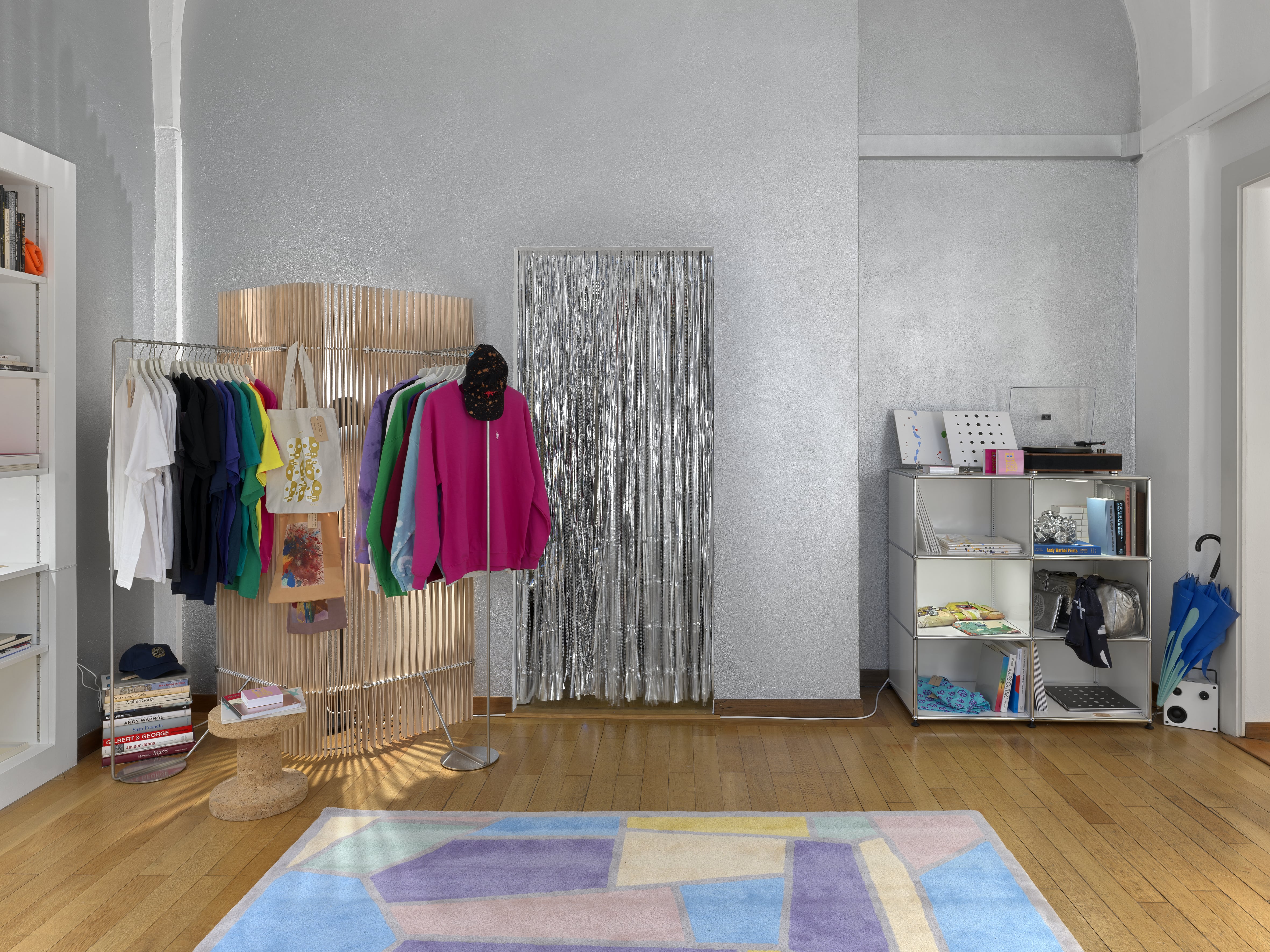 L’involucro è curato in ogni dettaglio: le pareti sono dipinte con strisce diagonali, declinate in un unico colore che caratterizza ciascuna stanza, mentre il pavimento è ricoperto da tappeti disegnati dall’artista. Lo spazio vive così a cavallo tra diverse tipologie d’uso: appartamento, negozio di moda o di design, grande magazzino di suppellettili e arredi elementari e minimali. Un luogo, insomma, in cui generi differenti di prodotti convivono democraticamente e indifferentemente.