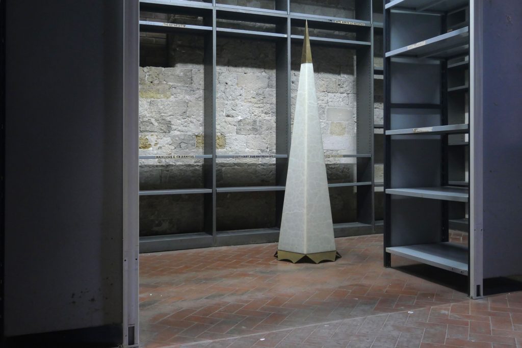 Lo stato delle cose e il loro avvenimento si configurano poeticamente nel progetto dell’artista attraverso precise collocazioni spaziali delle opere, come nel caso del corpo piramidale posizionato all’interno della biblioteca, dal cui interno una luce primordiale attraversa l’alabastro che lo costituisce e ne manifesta venature che ricordano le trasparenze della pelle umana. Questa apparizione improvvisa dal buio racconta il mistero dei vicoli di Palermo e di ogni città siciliana caratterizzata da strade strette, in cui angolo dopo angolo si scorgono bellezze mimetizzate e inaspettate.