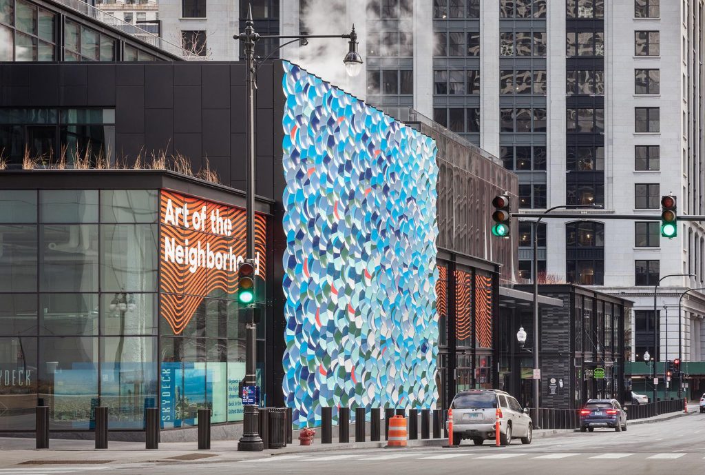 Quest’operazione di placemaking fa parte di un’iniziativa più ampia di EQ Office: Art of the Neighborhood, un programma avviato nel 2019 con lo scopo di portare l’arte nell’orbita della Willis Tower con lavori site specific, come quello di Jacob Hashimoto. Un arricchimento culturale per la comunità teso a trasformare il quartiere in un luogo creativo di riflessione, uno spazio di crescita. Per quest’ultimo intervento la scelta è ricaduta appunto su Olafur Eliasson, artista socialmente impegnato che ha trasformato una parete dell’iconico grattacielo in una “onda atmosferica”.