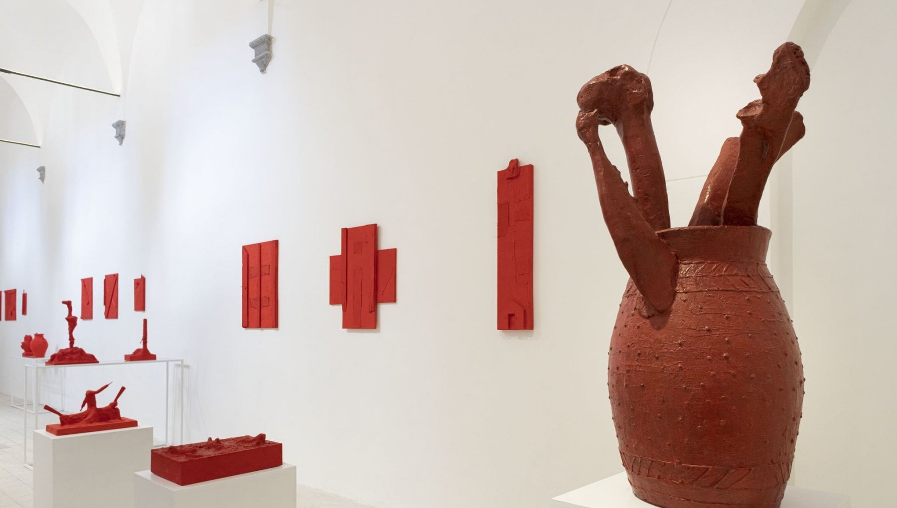 Al centro della grande sala, che è il lungo corridoio che univa due parti del vecchio monastero, dei banchi sostengono sculture a tutto tondo. Alcune sono, anche loro, figure senza testa. Altre hanno la testa ma il loro volto è coperto, nascosto. Perché il volto identifica questa o quella persona e, invece, qui si dice della generale, dolente condizione umana, dell’uomo che, impedito da vincoli feroci, stretto da bende che gli vietano di muoversi, di vivere, ha brama di liberarsene. Così, qui l’arte parla del grigiore del dolore e dei pensieri tristi, mentre dice, con il bellissimo inimitabile colore rosso, del sangue che scorre nelle vene, di un forte, folle desiderio di vita.